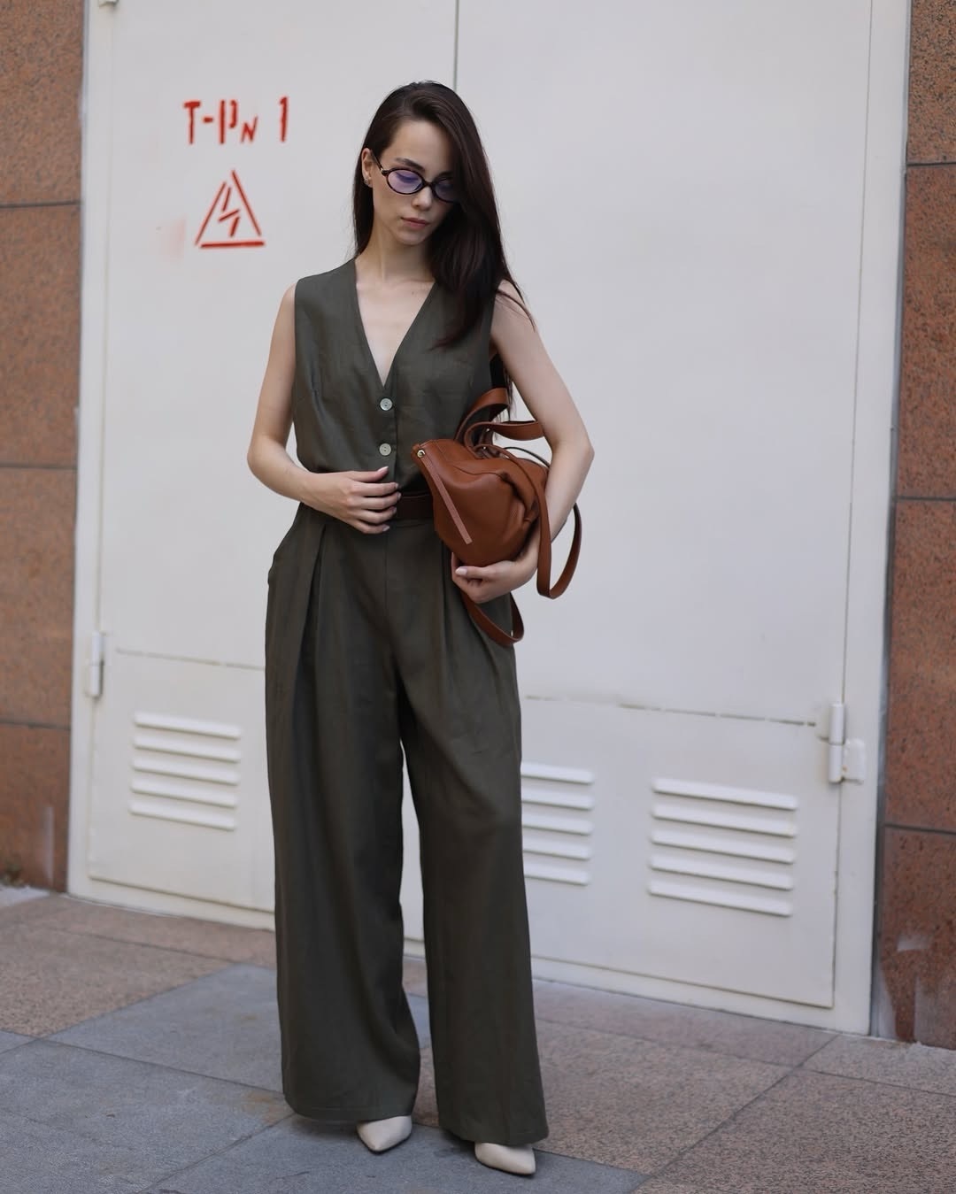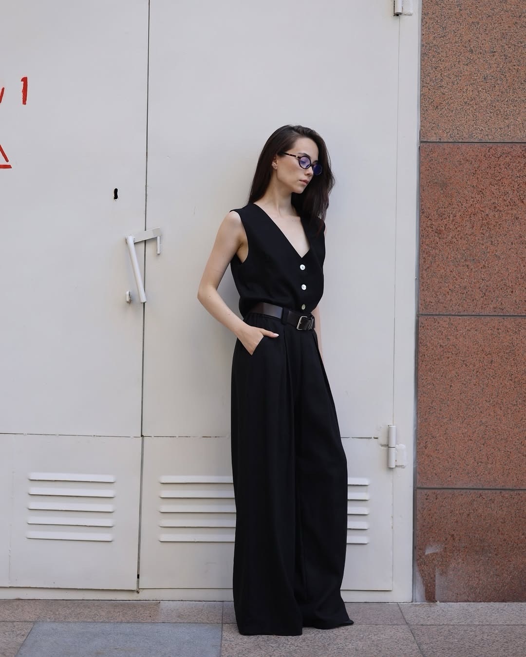 широкие брюки с высокой посадкой, вытачками и поясом в комплекте. акцент на талии и струящаяся длина визуально вытягивают силуэт.