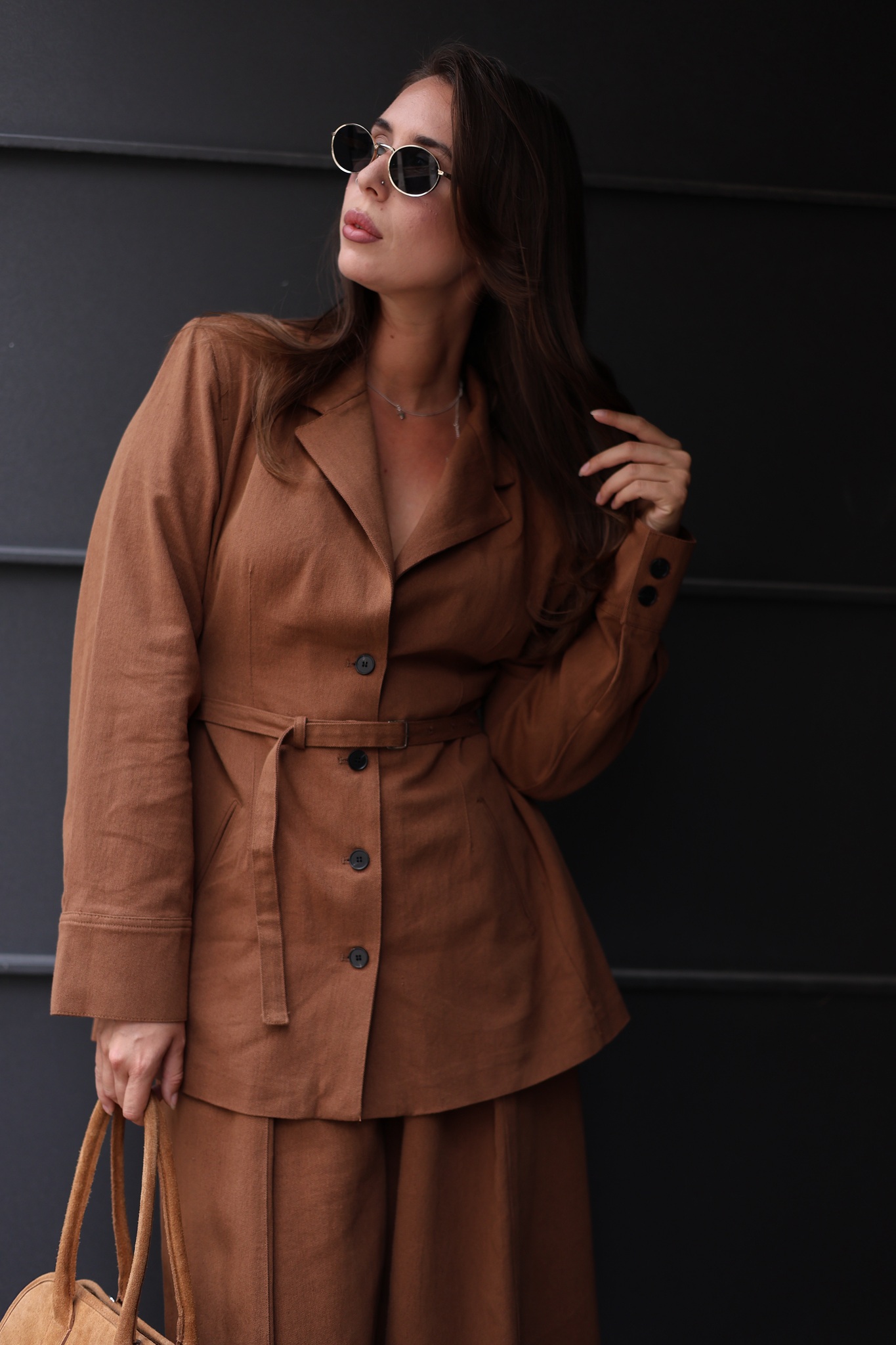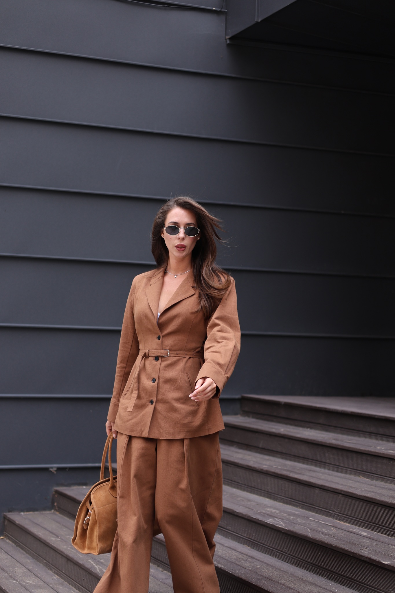 высокая посадка и мягкие защипы создают свободный силуэт, вытягивают линию ног и не сковывают движения.