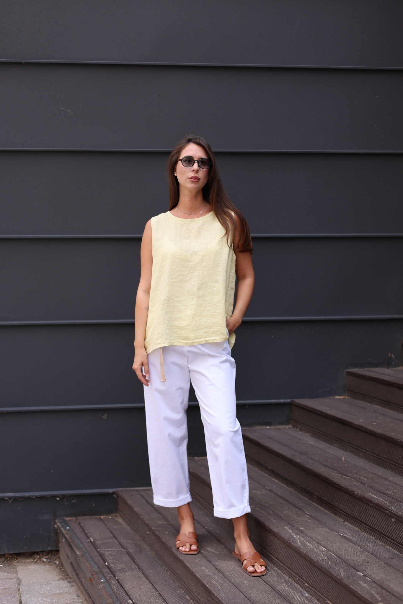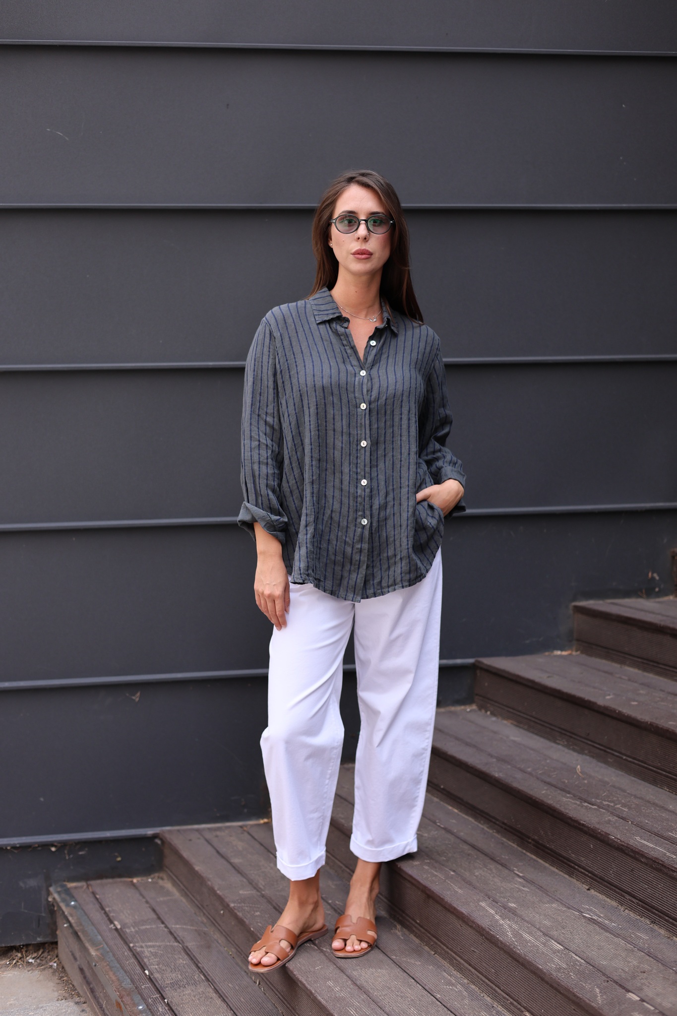 свободный прямой крой, высокая посадка, складки добавляют аккуратный объём и делают посадку удобной.