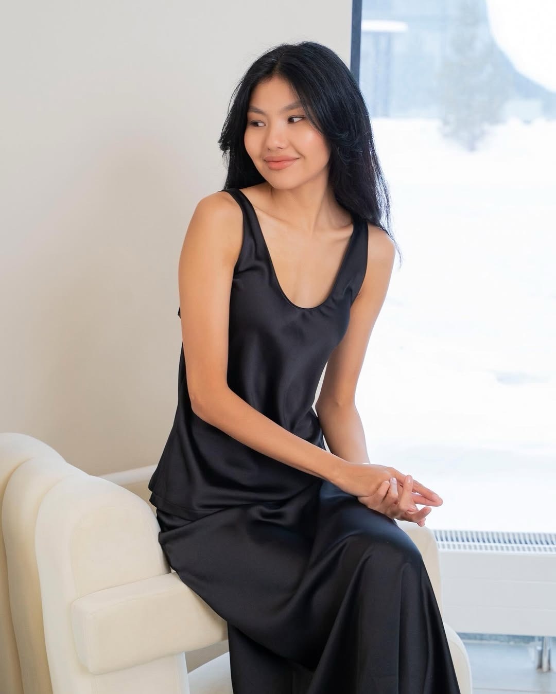 комплект из гладкого струящегося материала с атласным блеском. базовая майка с глубоким вырезом и свободной посадкой сочетается с длинной юбкой на мягкой резинке — комфортной и универсальной. носите вместе или по отдельности — идеальный дуэт для жарких дней и вечерних выходов.