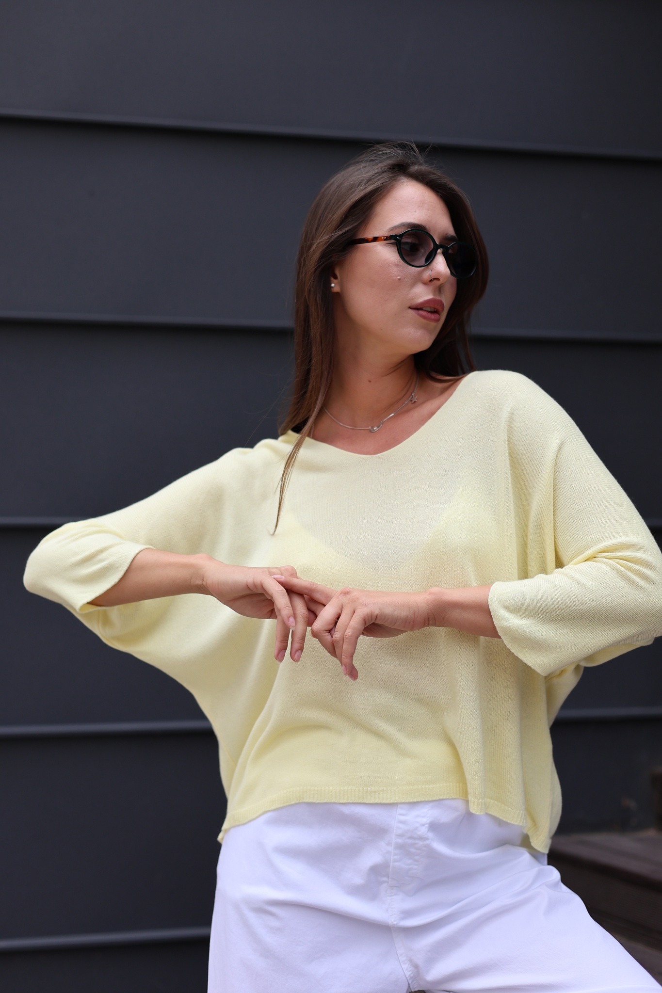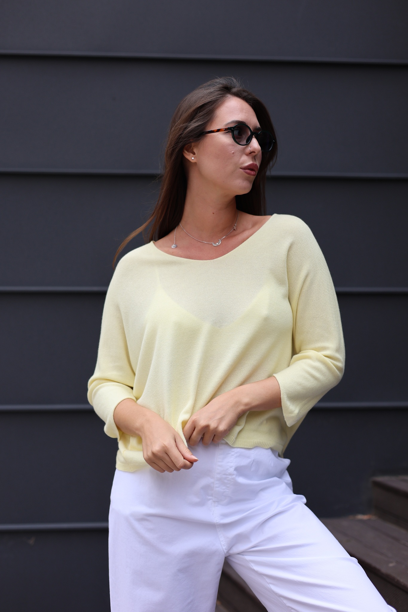 свободный крой и спущенное плечо создают расслабленный силуэт, а нежный пастельный оттенок добавляет свежести образу.