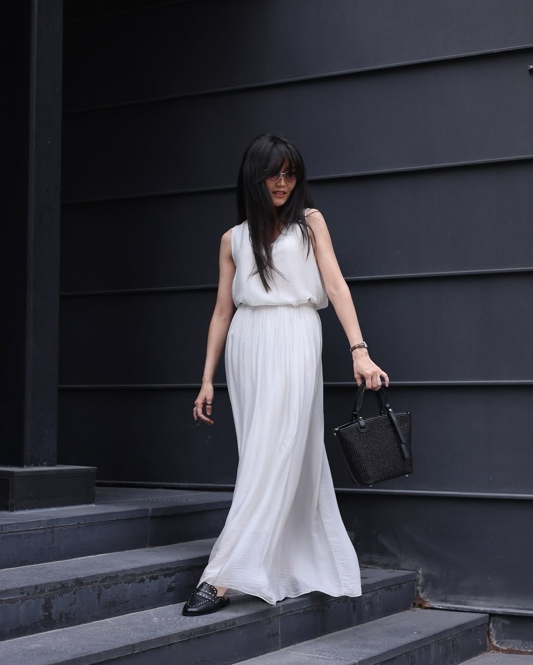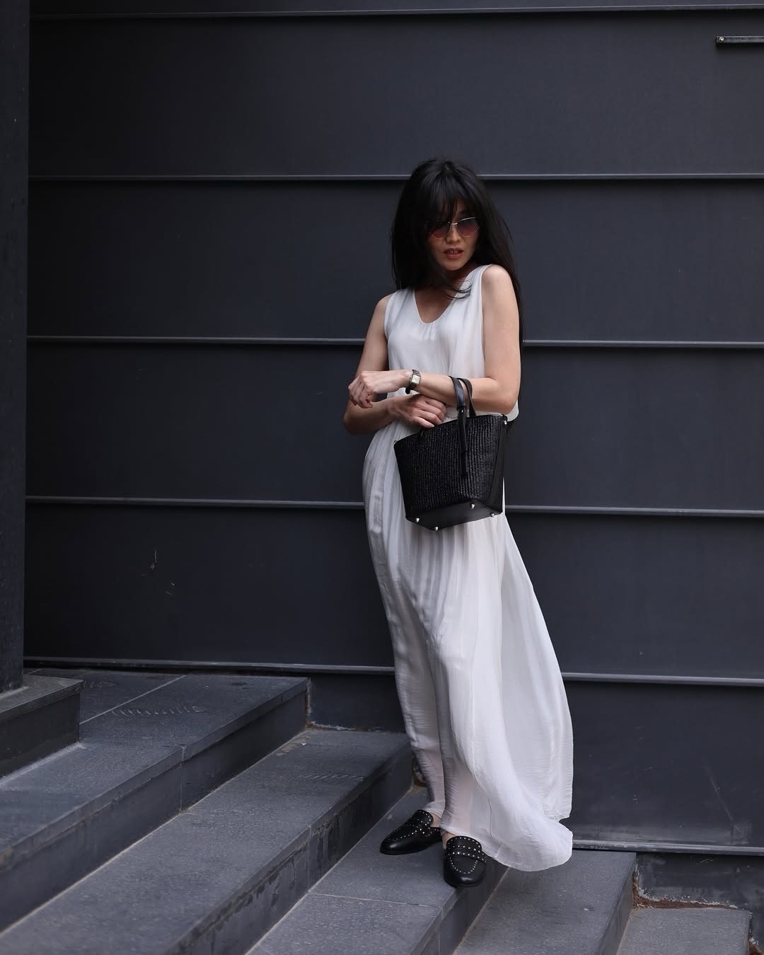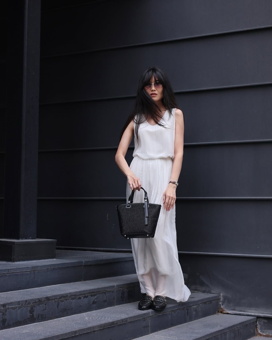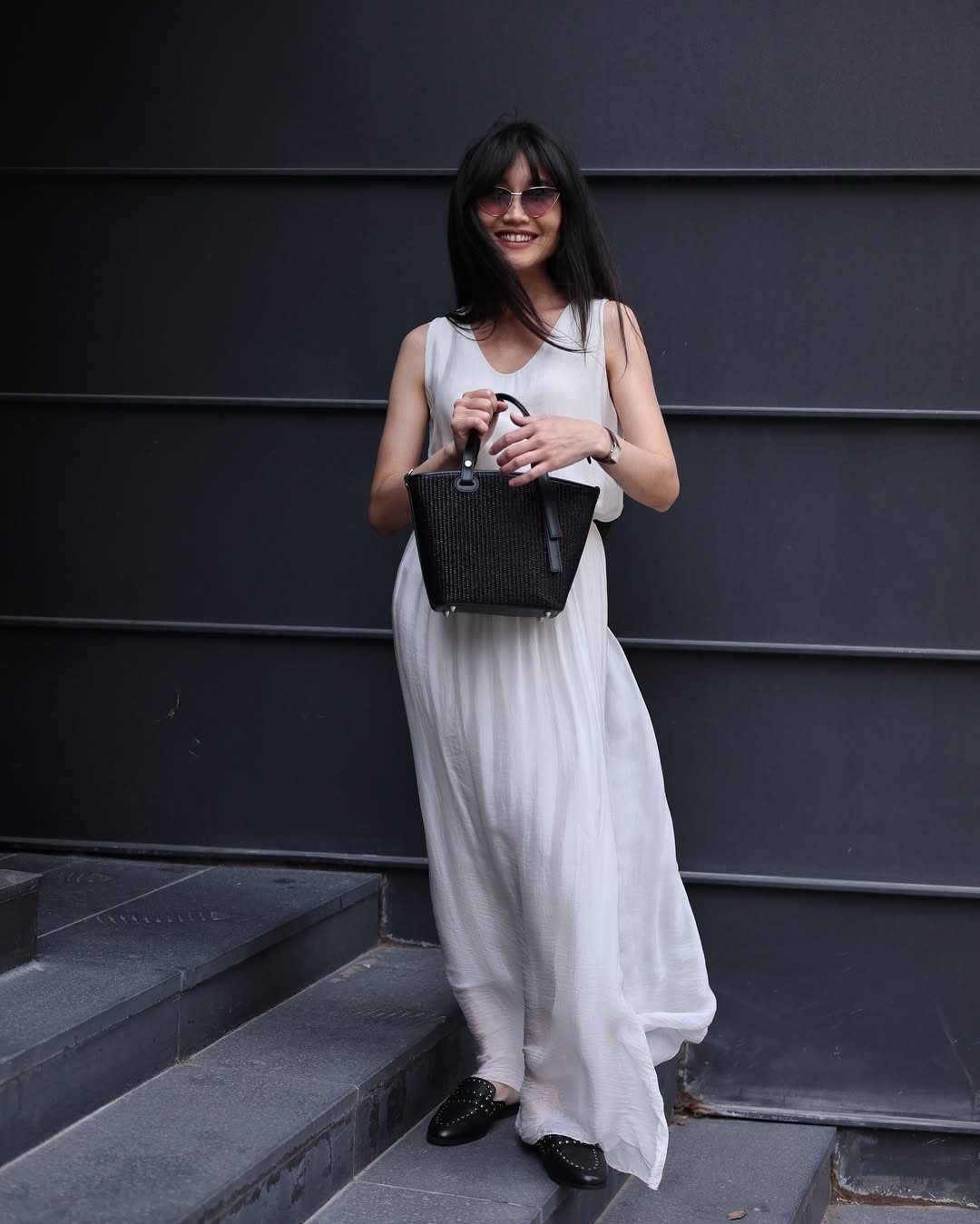 топ на широких бретелях с мягкой посадкой и лёгкой драпировкой, юбка макси с эластичной талией и струящимся силуэтом.