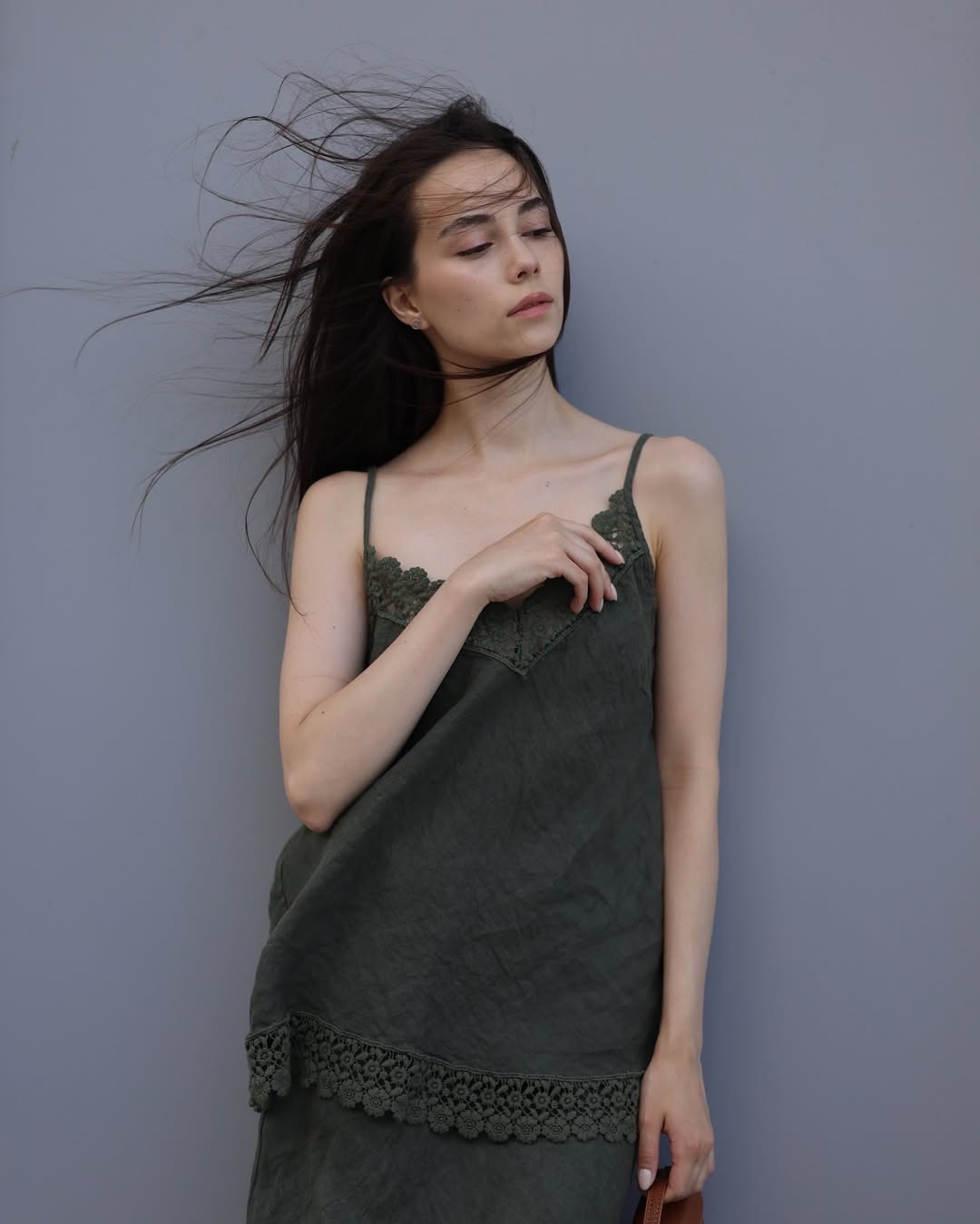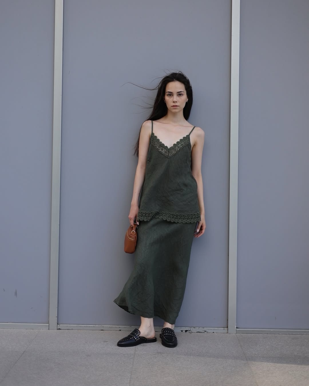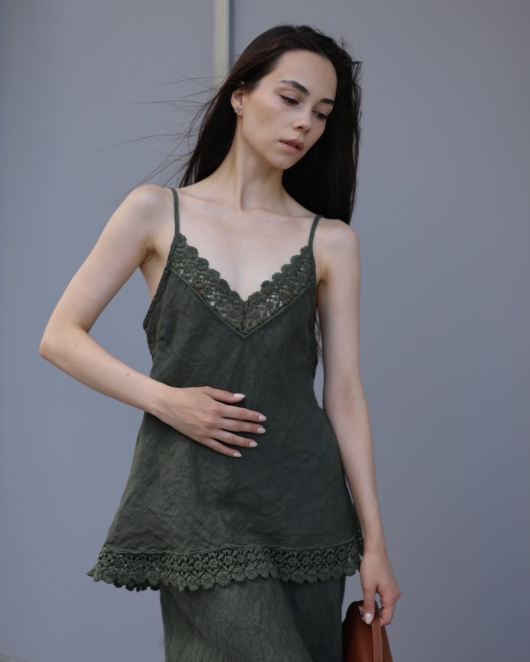 топ на тонких бретелях с v-образным вырезом, украшен хлопковым кружевом по линии груди и низу. юбка прямого кроя, мягко облегающая фигуру.