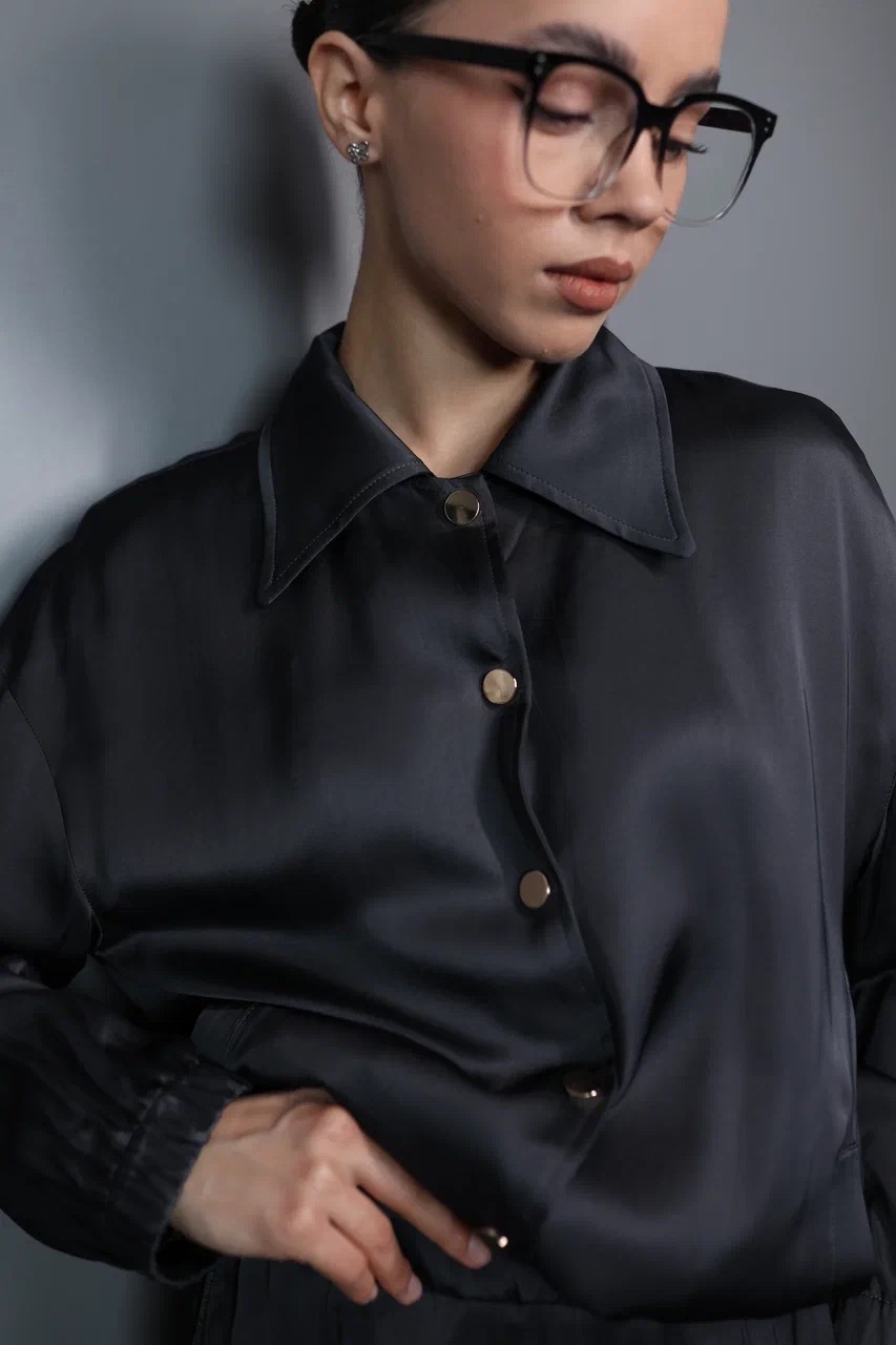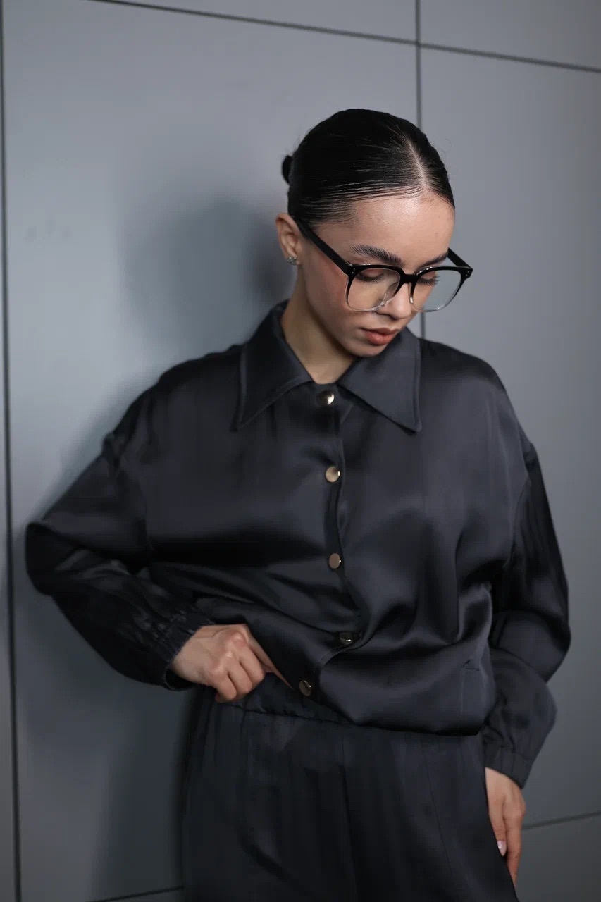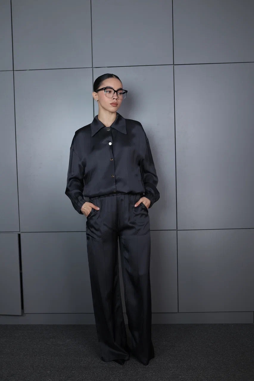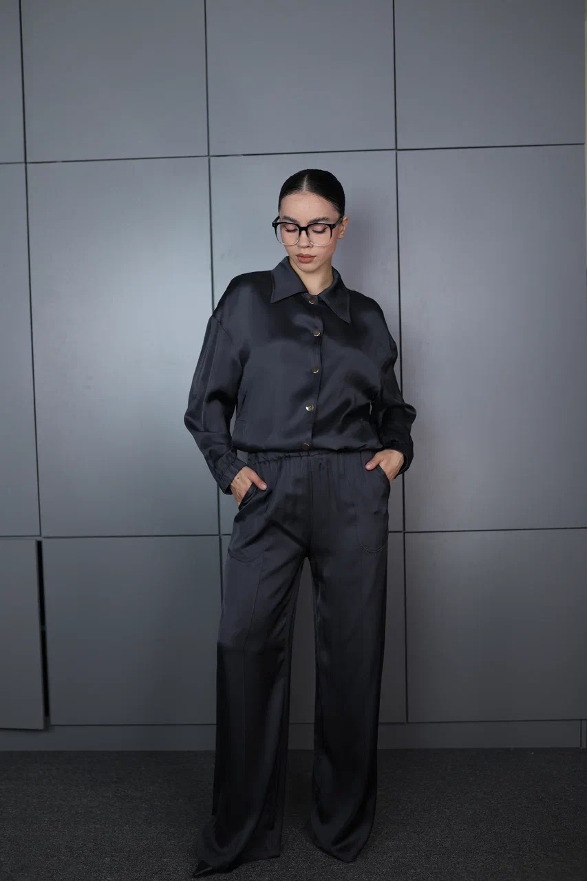 благородный блеск и мягкая фактура ткани делают этот костюм универсальным вариантом как для офиса, так и для вечернего выхода. свободный крой и эластичный пояс на брюках обеспечивают комфорт и свободу движений. рубашка на пуговицах с классическим воротником добавляет образу завершённости и элегантности.