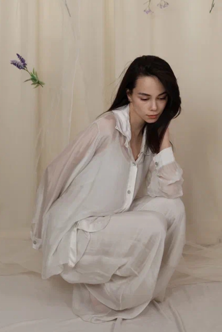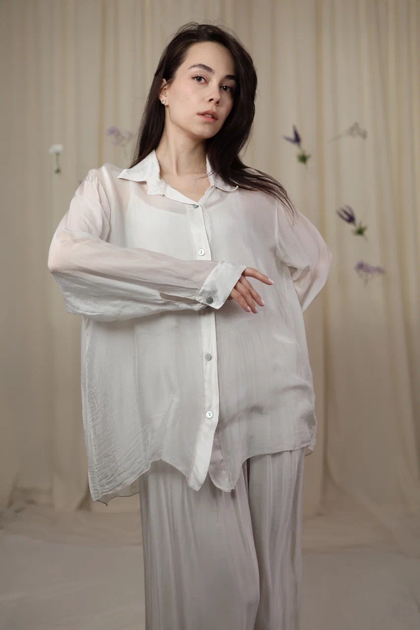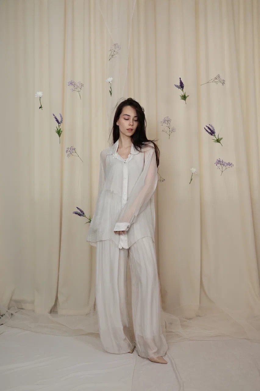 воздушный и нежный комплект из струящейся полупрозрачной ткани. свободная рубашка с воротником и широкие брюки создают расслабленный силуэт. топ можно носить отдельно или под пиджак.