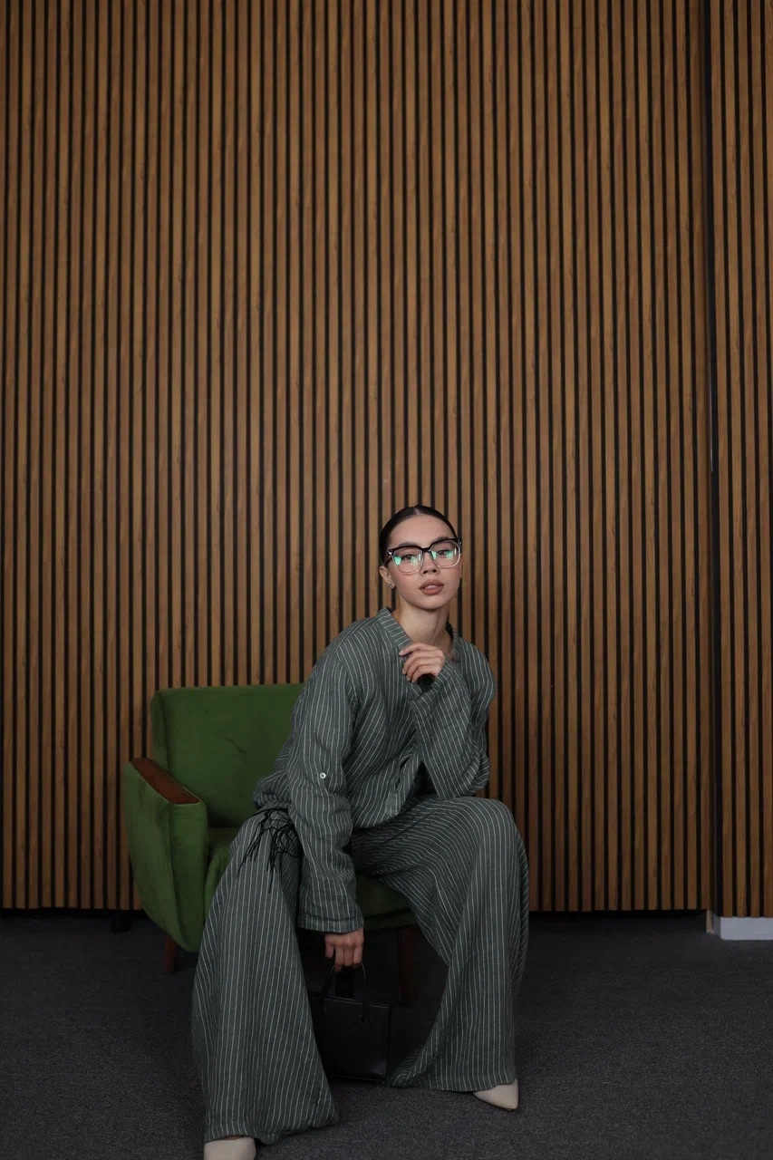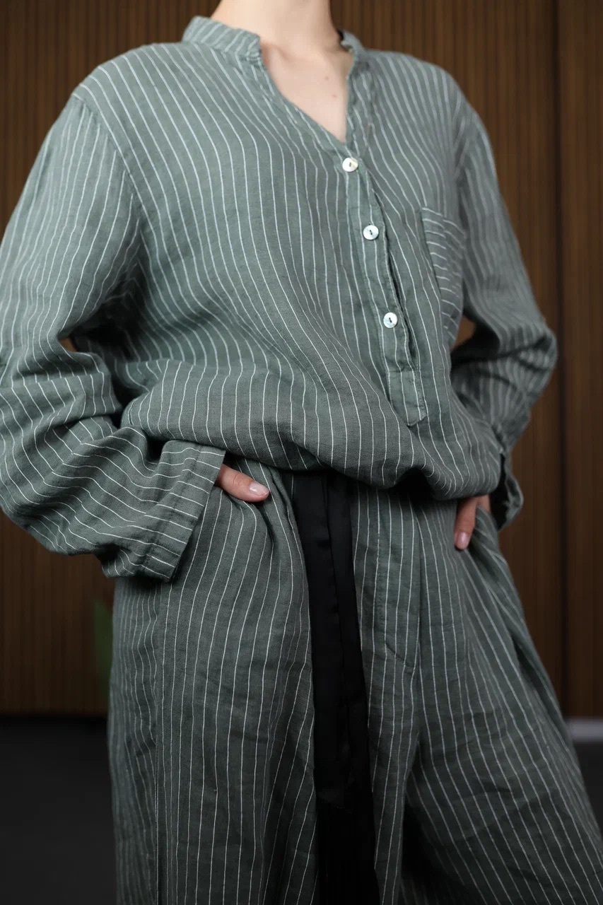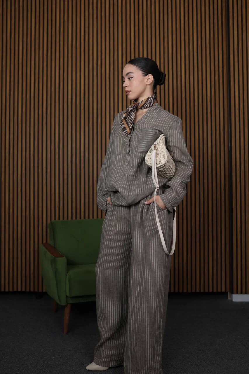 универсальный комплект из рубашки без воротника и широких брюк. прямой крой, мягкий лен и вертикальная белая полоска визуально вытягивают силуэт и не сковывают движения. можно носить вместе или по отдельности, создавая десятки образов — от расслабленных до городских.