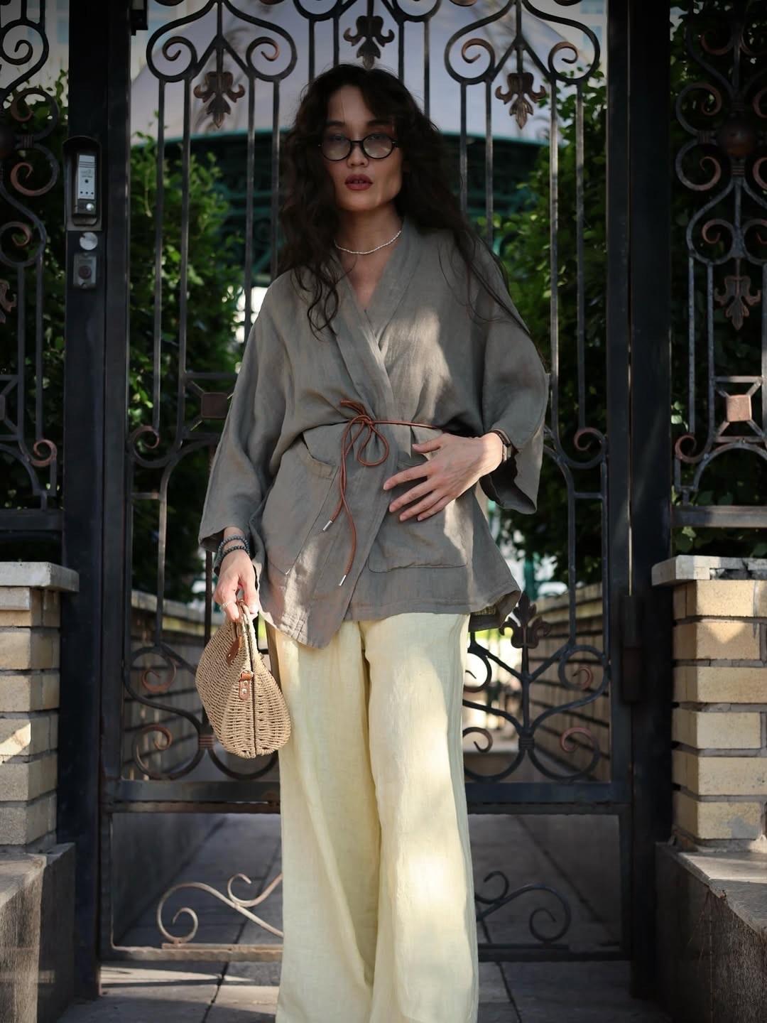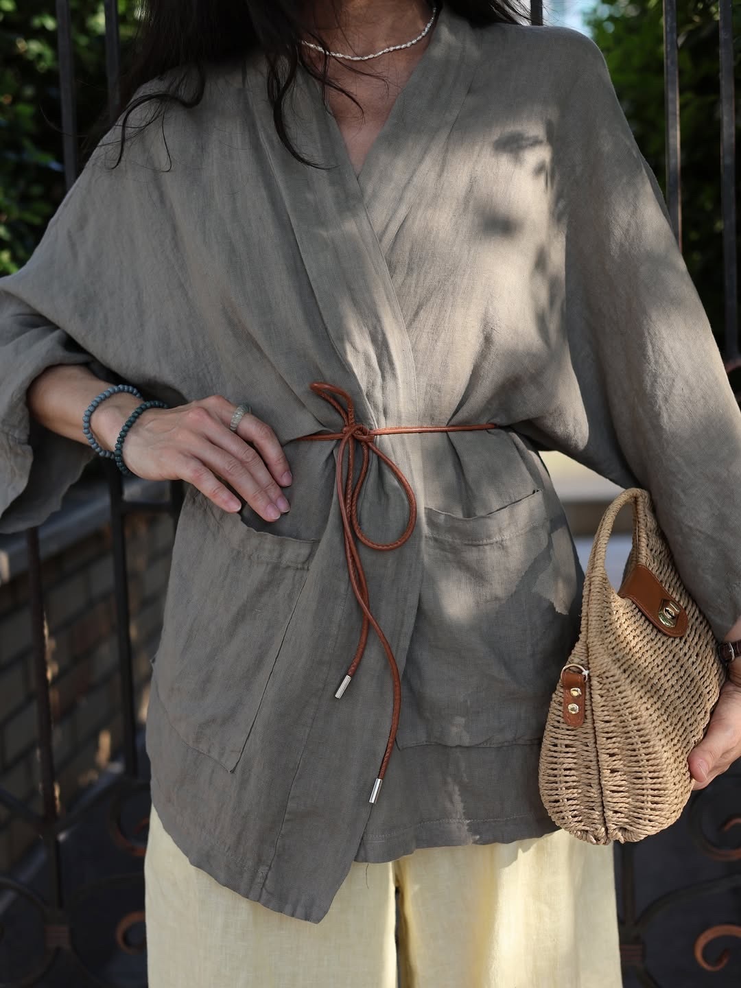 лёгкая льняная накидка с запахом — универсальный вариант на лето.