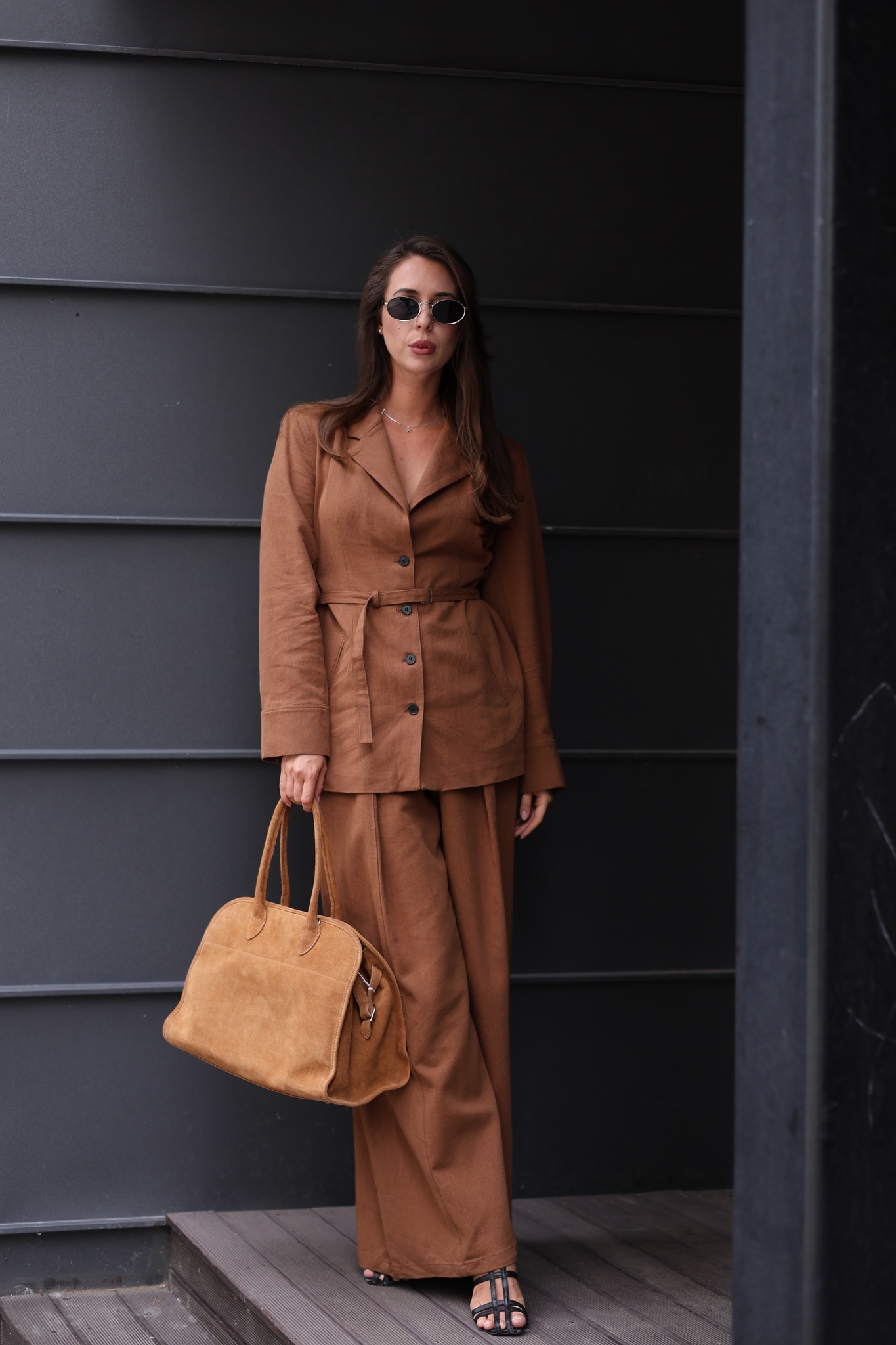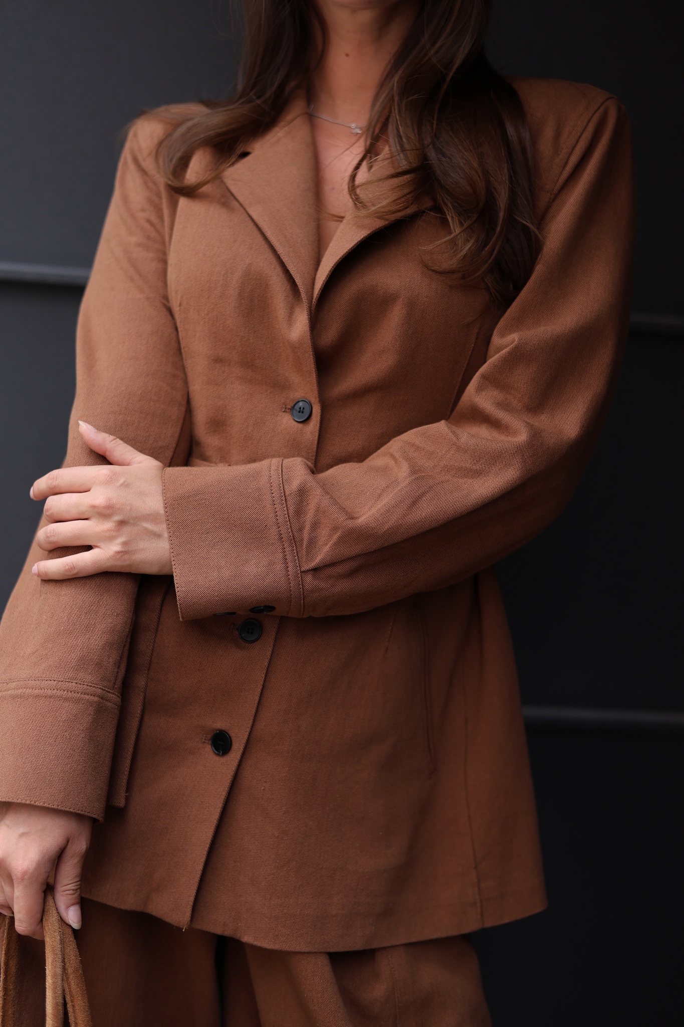 приталенный жакет с акцентом на талию. можно носить как с поясом, так и без — образ будет выглядеть элегантно и расслабленно в зависимости от ситуации. классический воротник, длинный рукав и ровная линия плеч создают аккуратный силуэт.