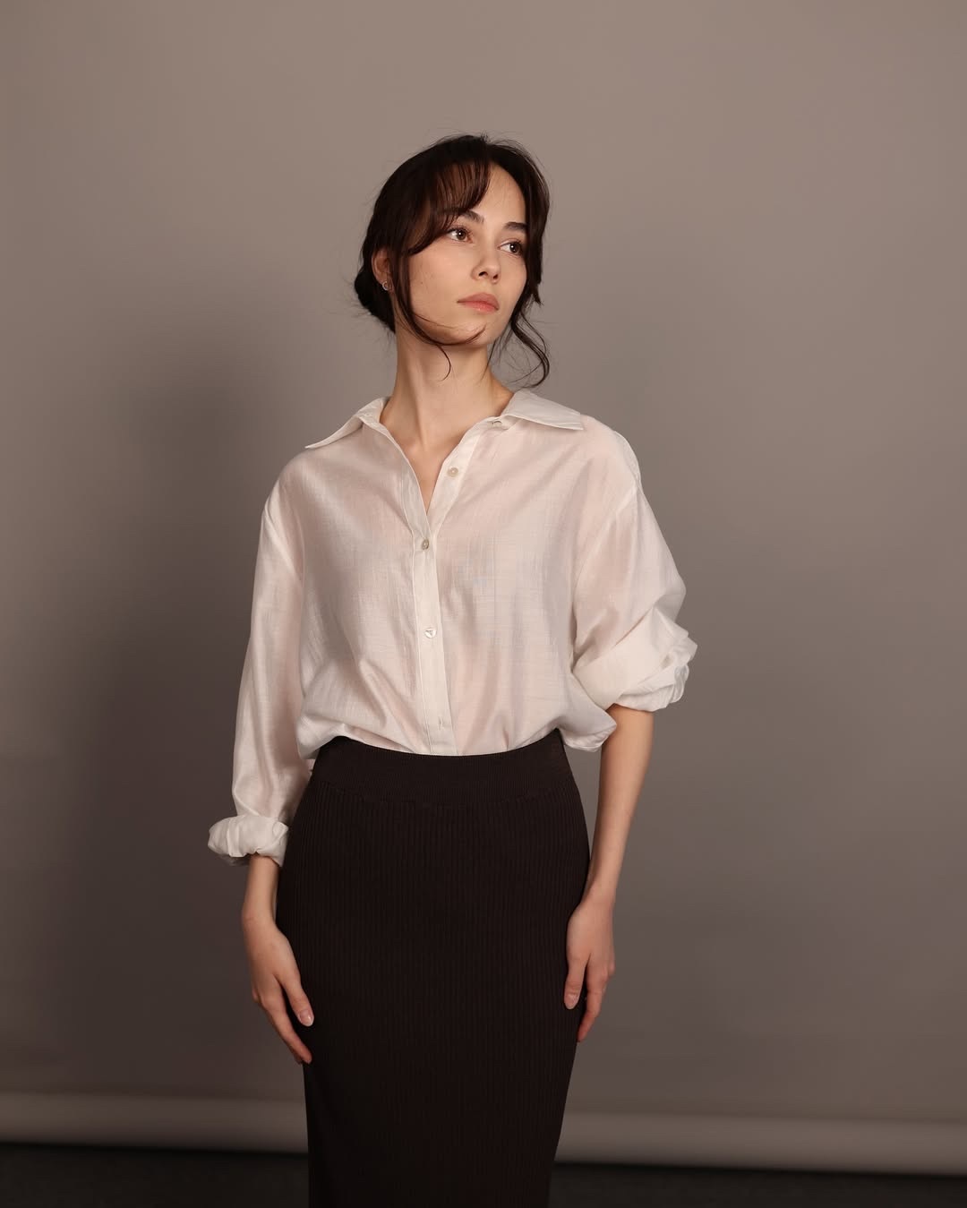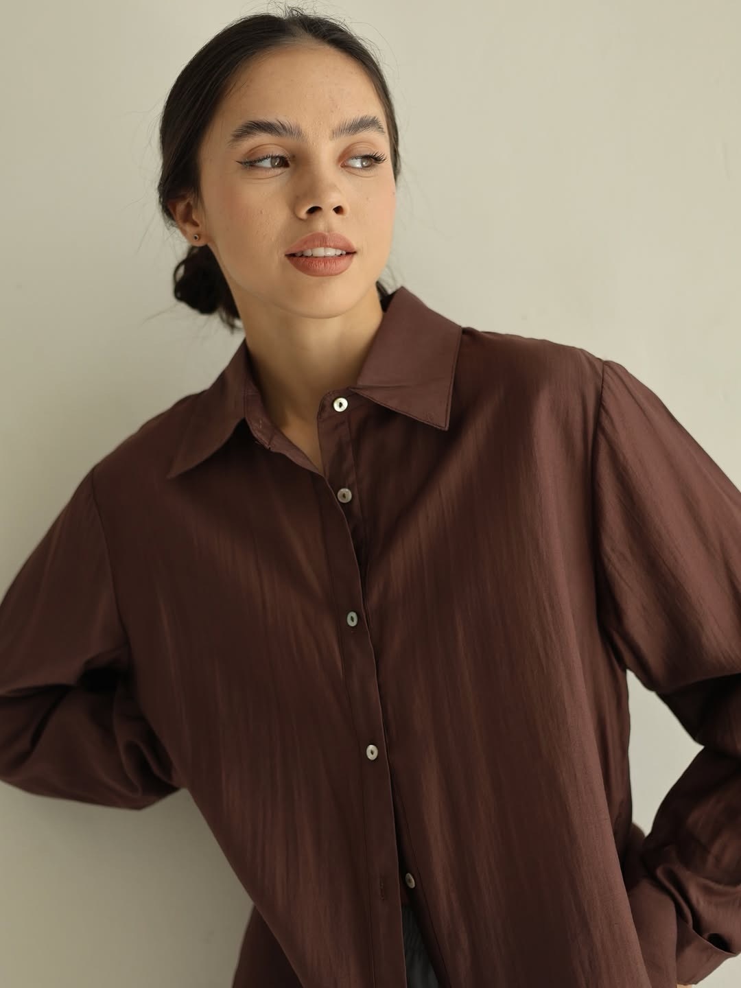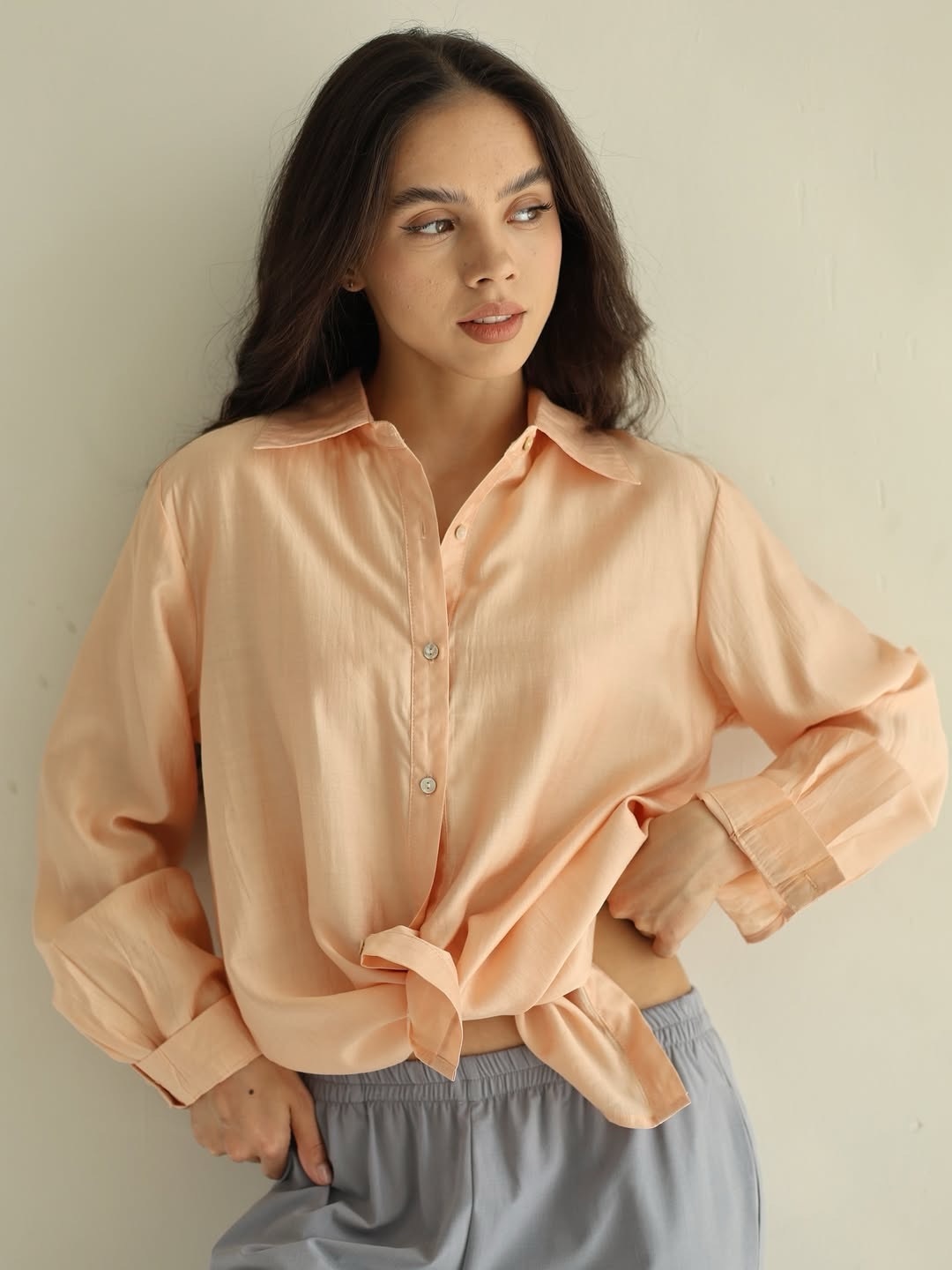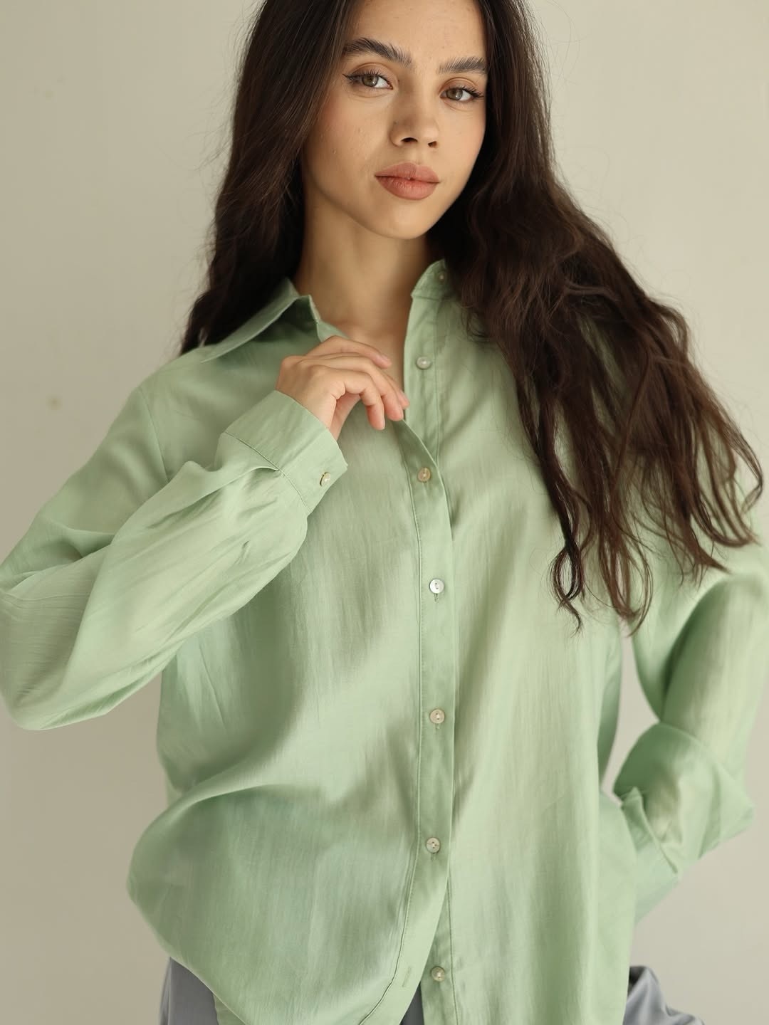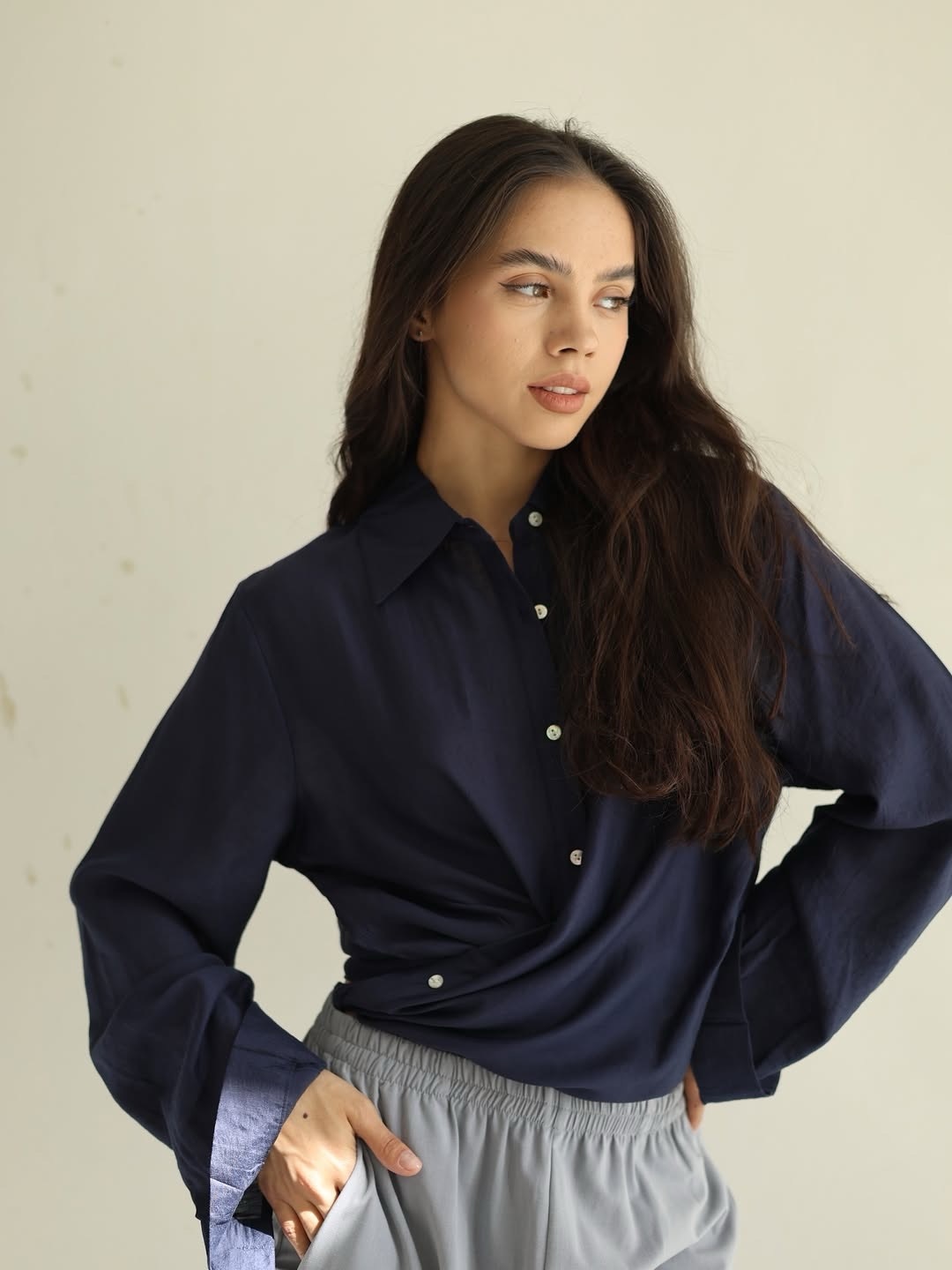 классический отложной воротник и пуговицы по всей длине делают модель универсальной и подходящей как для офиса, так и для повседневных образов.