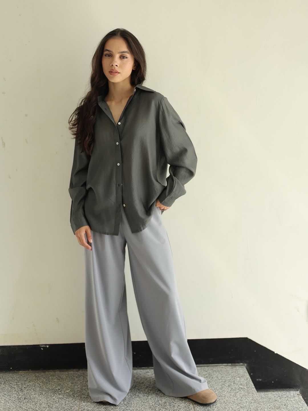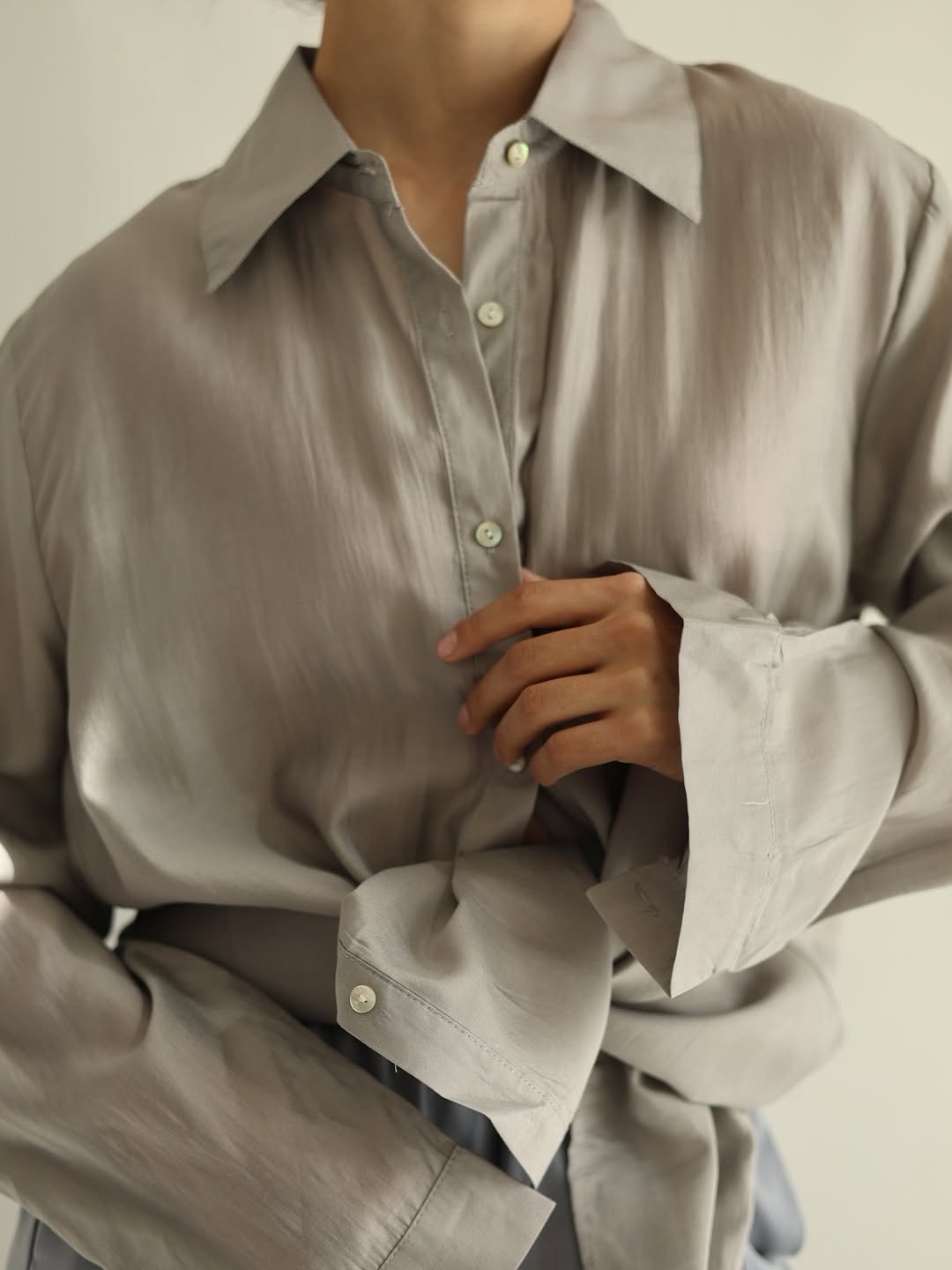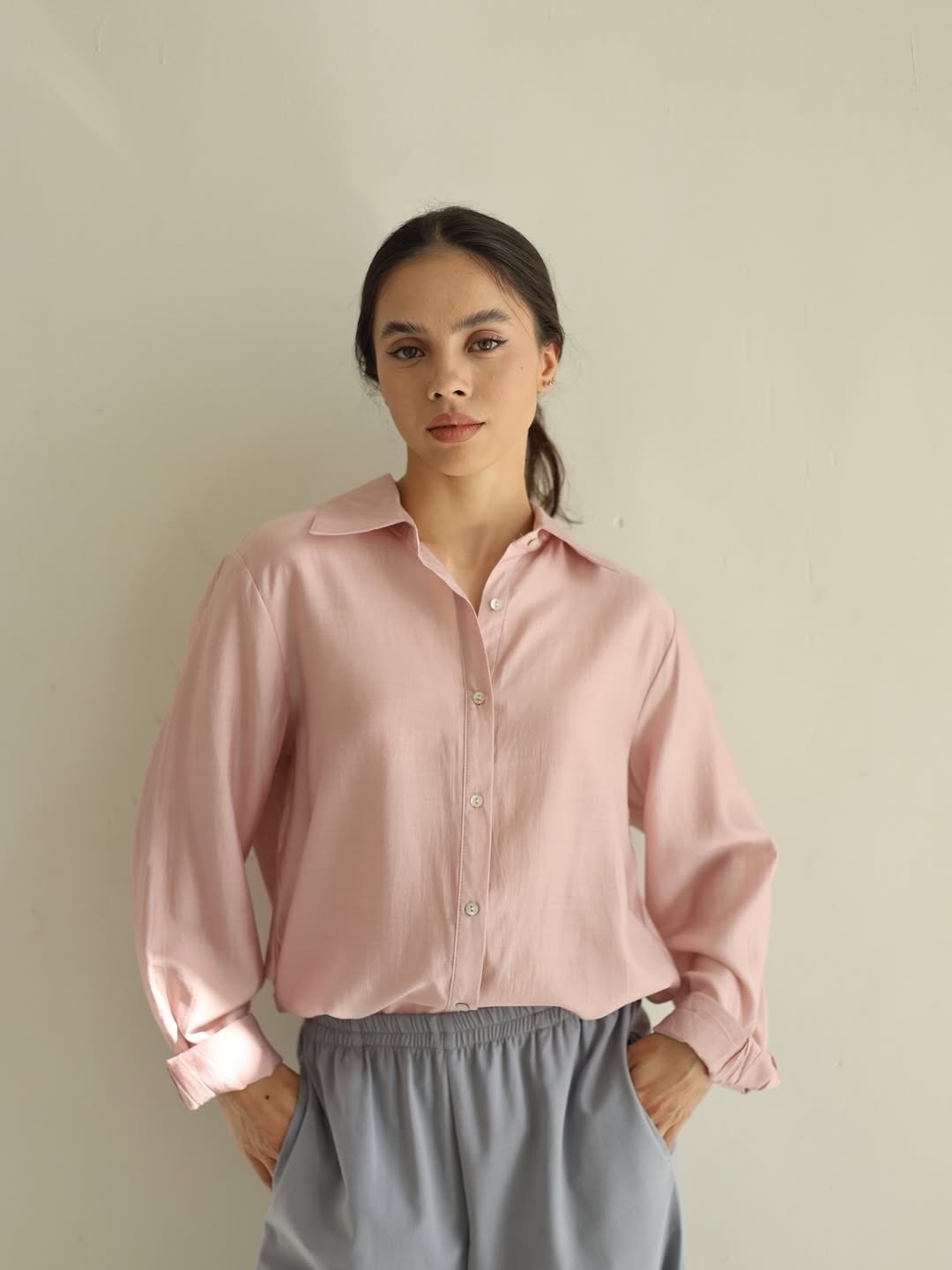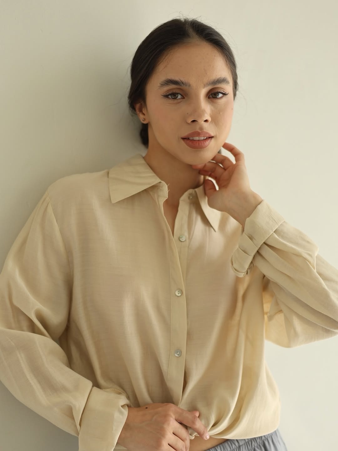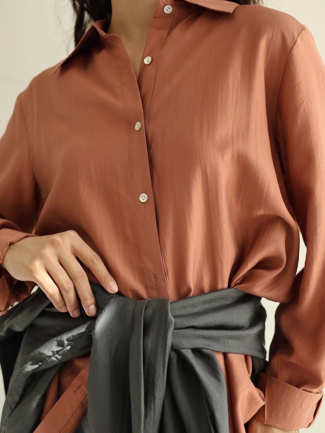 классический отложной воротник и пуговицы по всей длине делают модель универсальной и подходящей как для офиса, так и для повседневных образов.