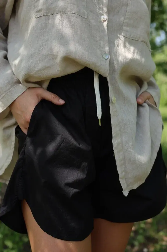 лёгкие чёрные шорты свободного силуэта — идеальный вариант для жарких дней. высокая посадка и эластичный пояс с мягкой кулиской обеспечивают комфорт и посадку по фигуре. натуральная ткань, приятная к телу, хорошо пропускает воздух и быстро сохнет. удобные боковые карманы — для ключей или телефона. отлично сочетаются с льняной рубашкой, топом или кроп-футболкой.