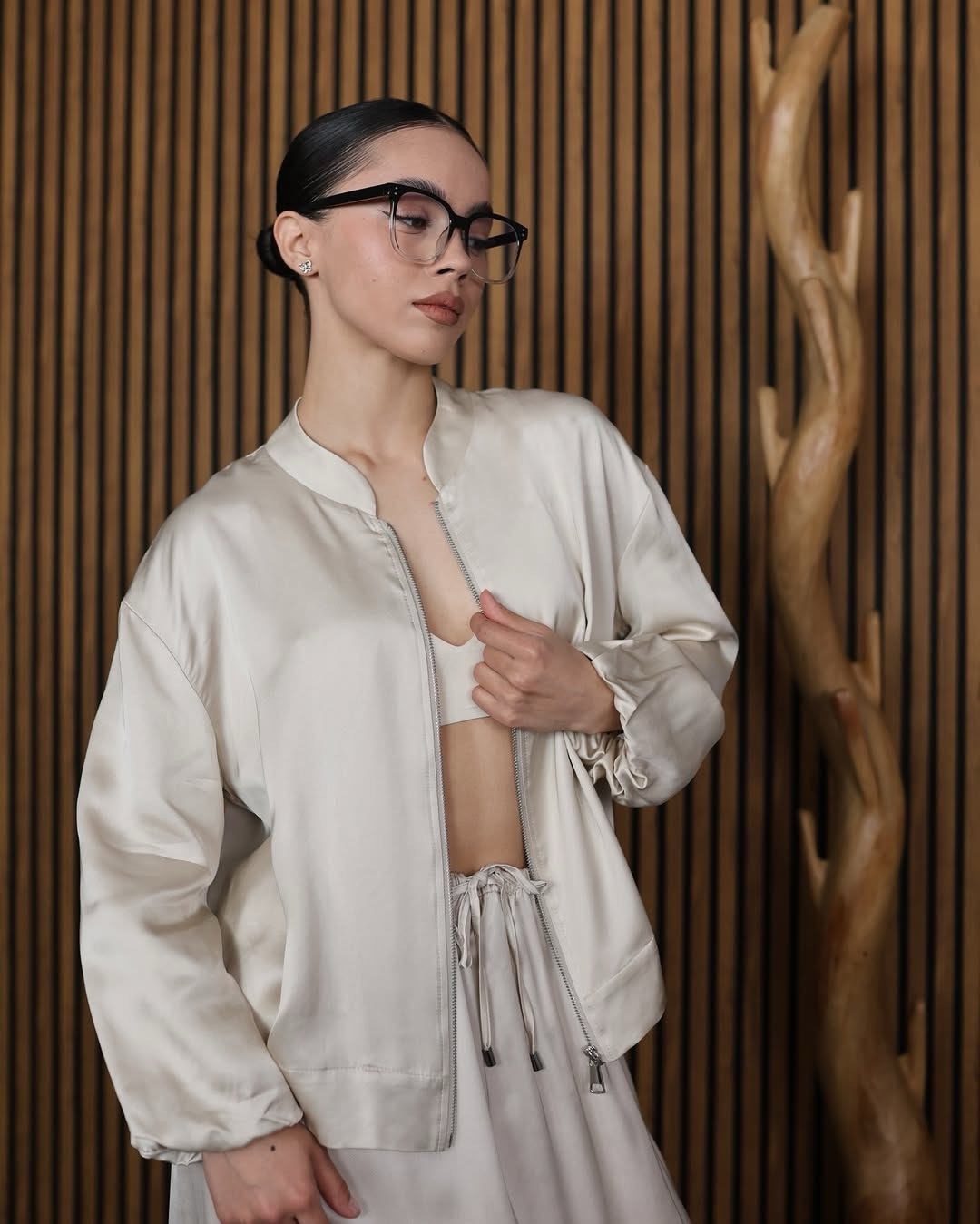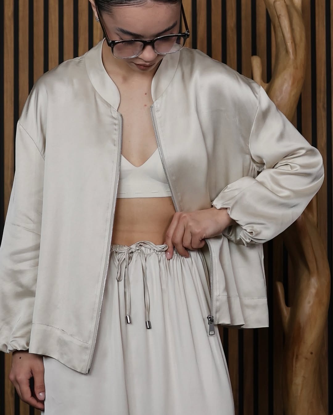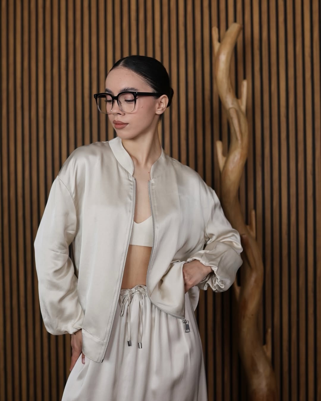 укороченный бомбер на молнии из матового сатина с лёгким блеском. воротник-стойка, объёмные рукава с мягкими манжетами и аккуратные швы.