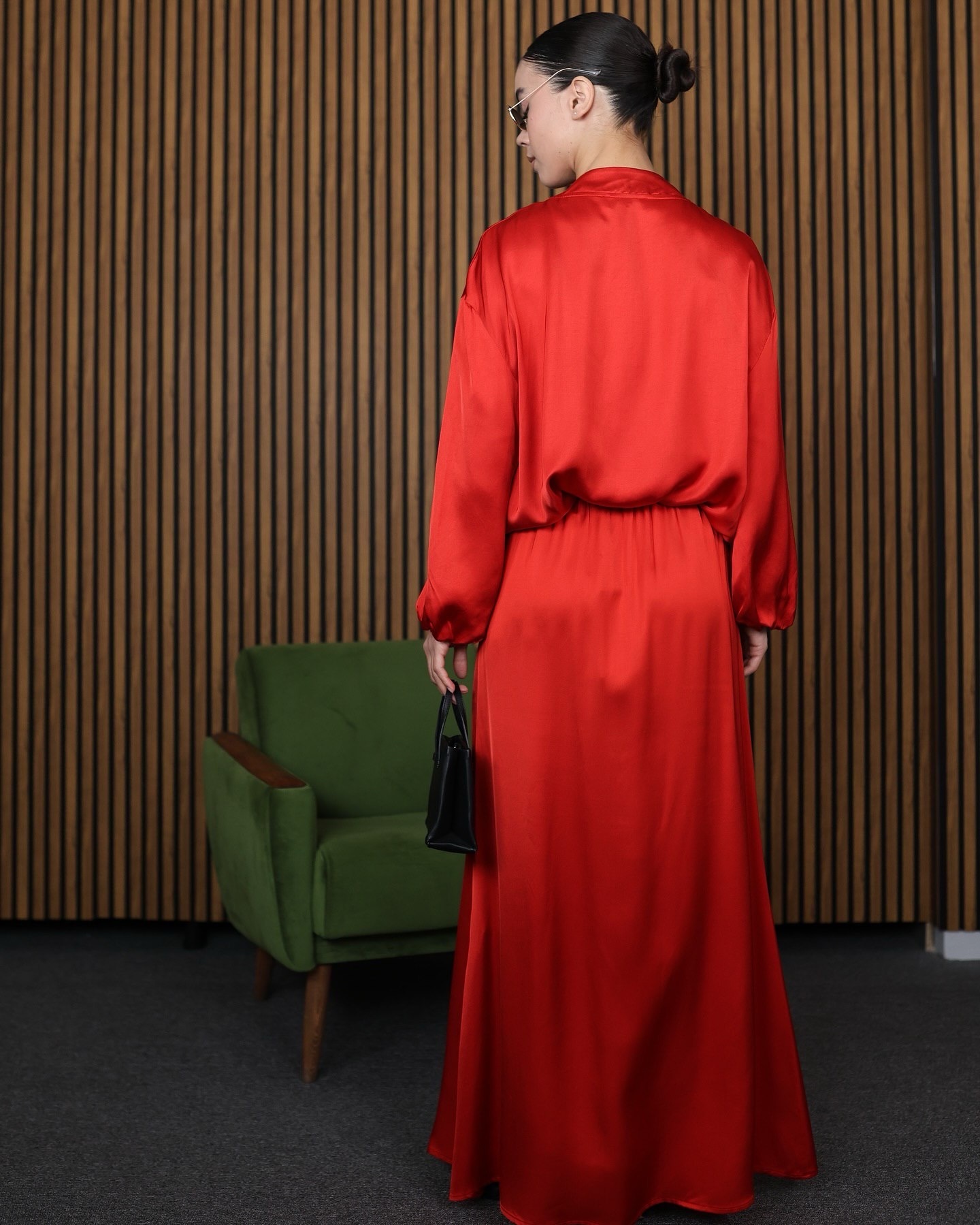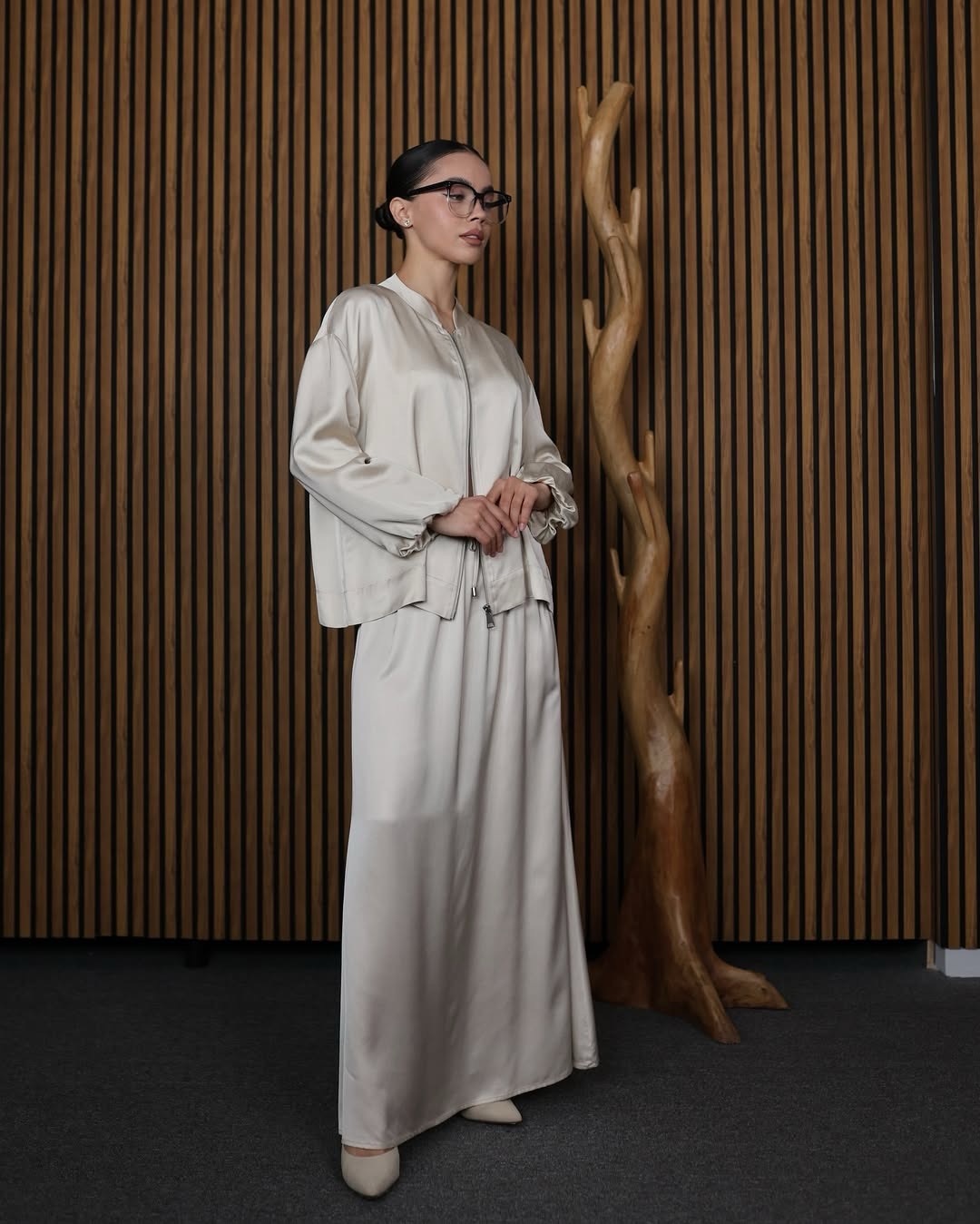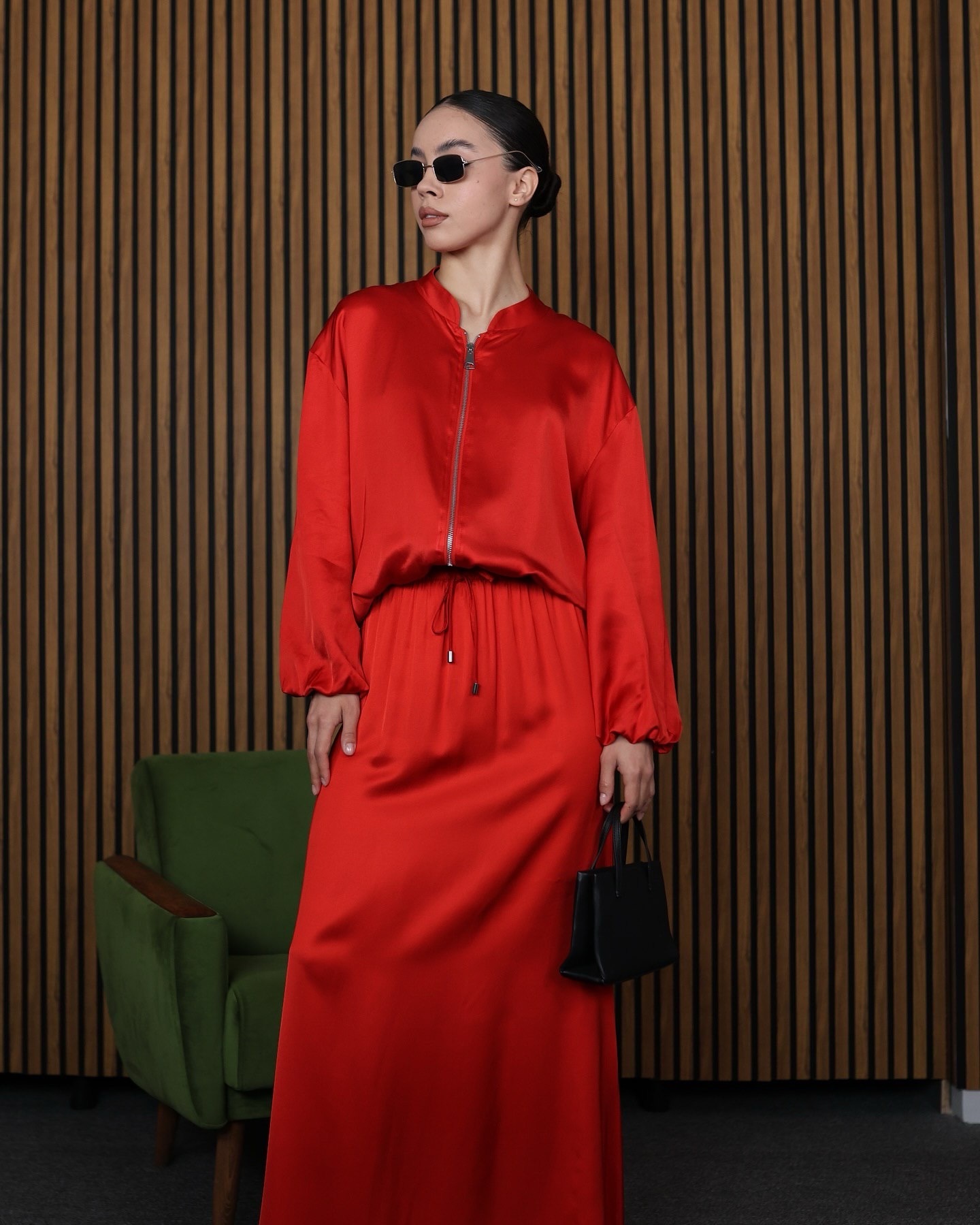 укороченный бомбер на молнии из матового сатина с лёгким блеском. воротник-стойка, объёмные рукава с мягкими манжетами и аккуратные швы.