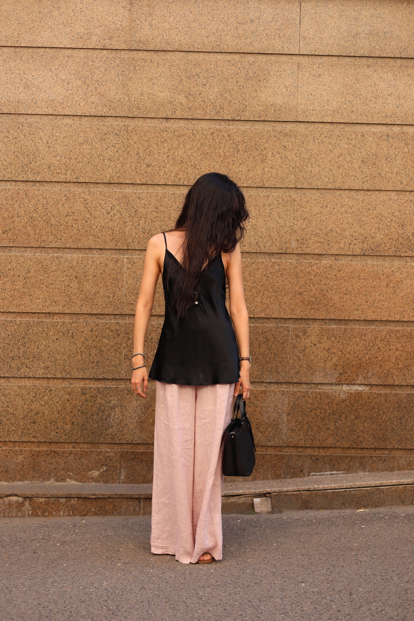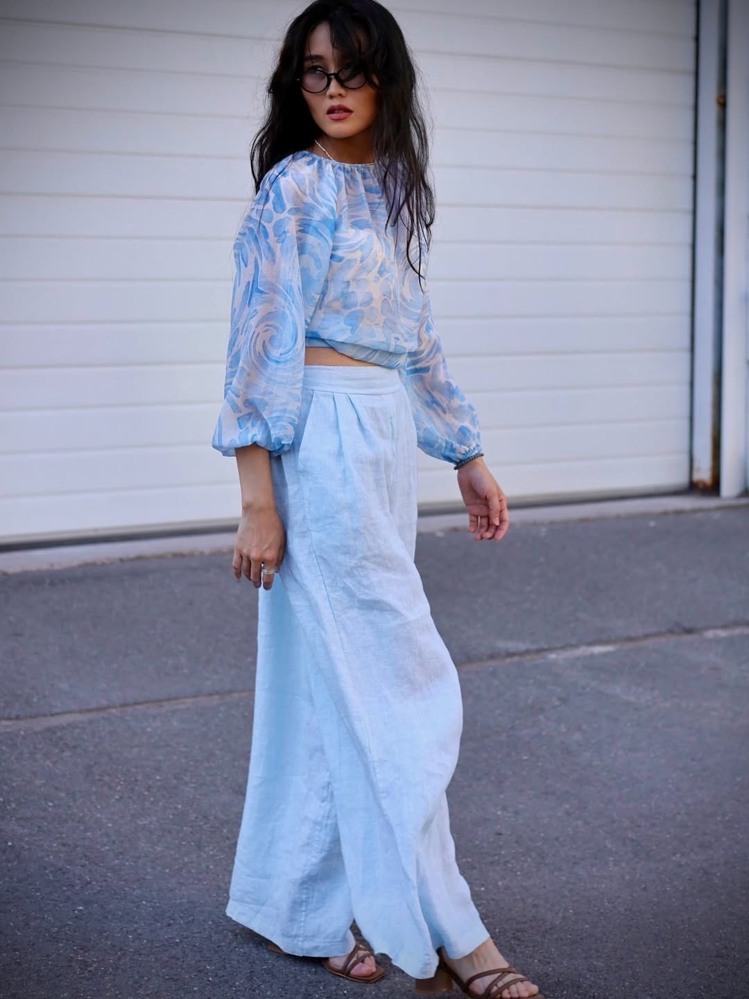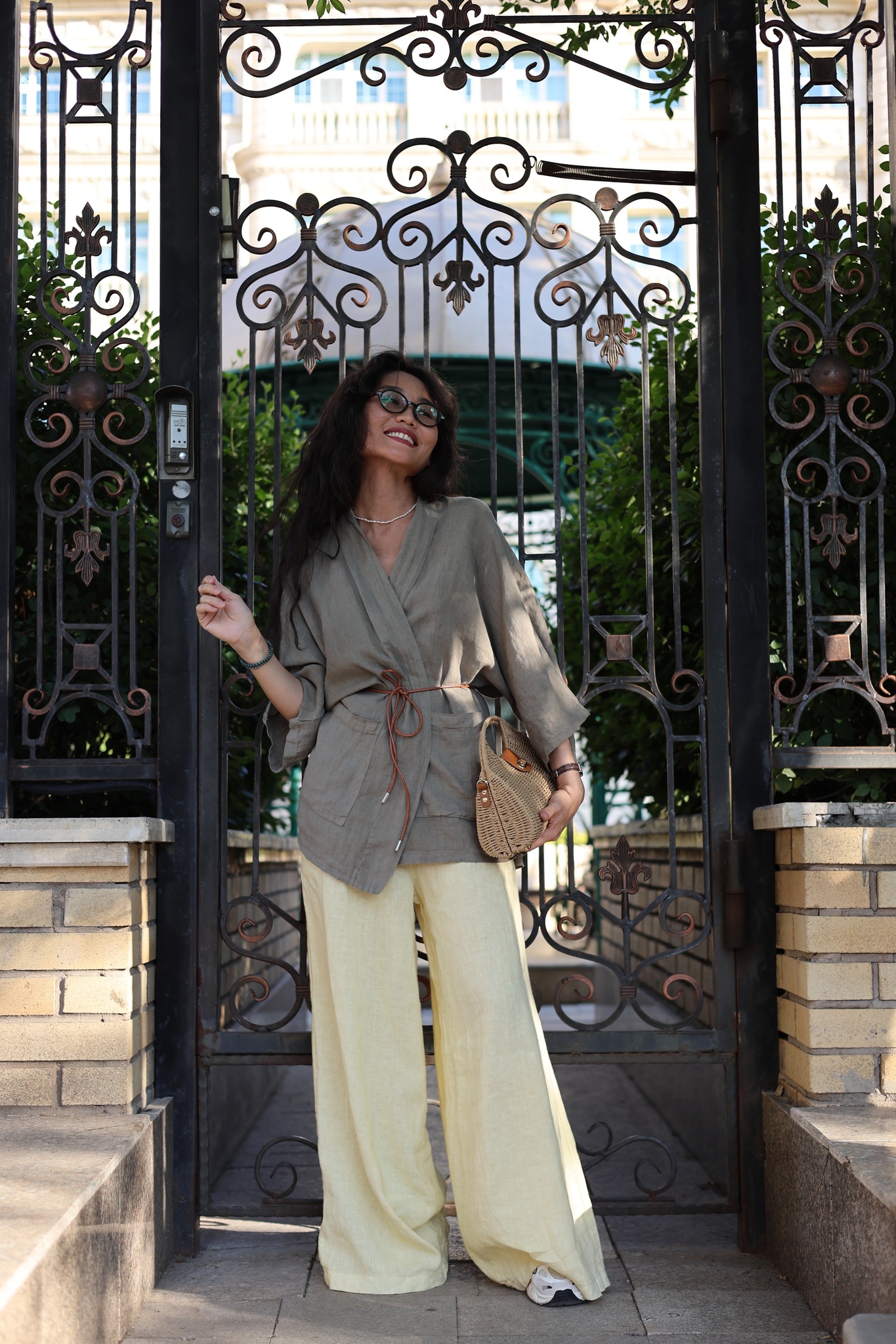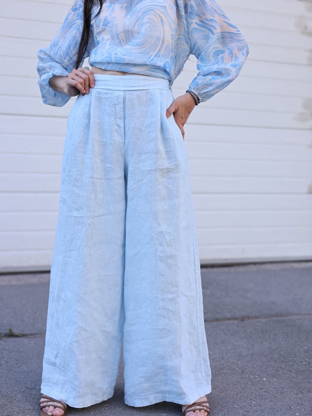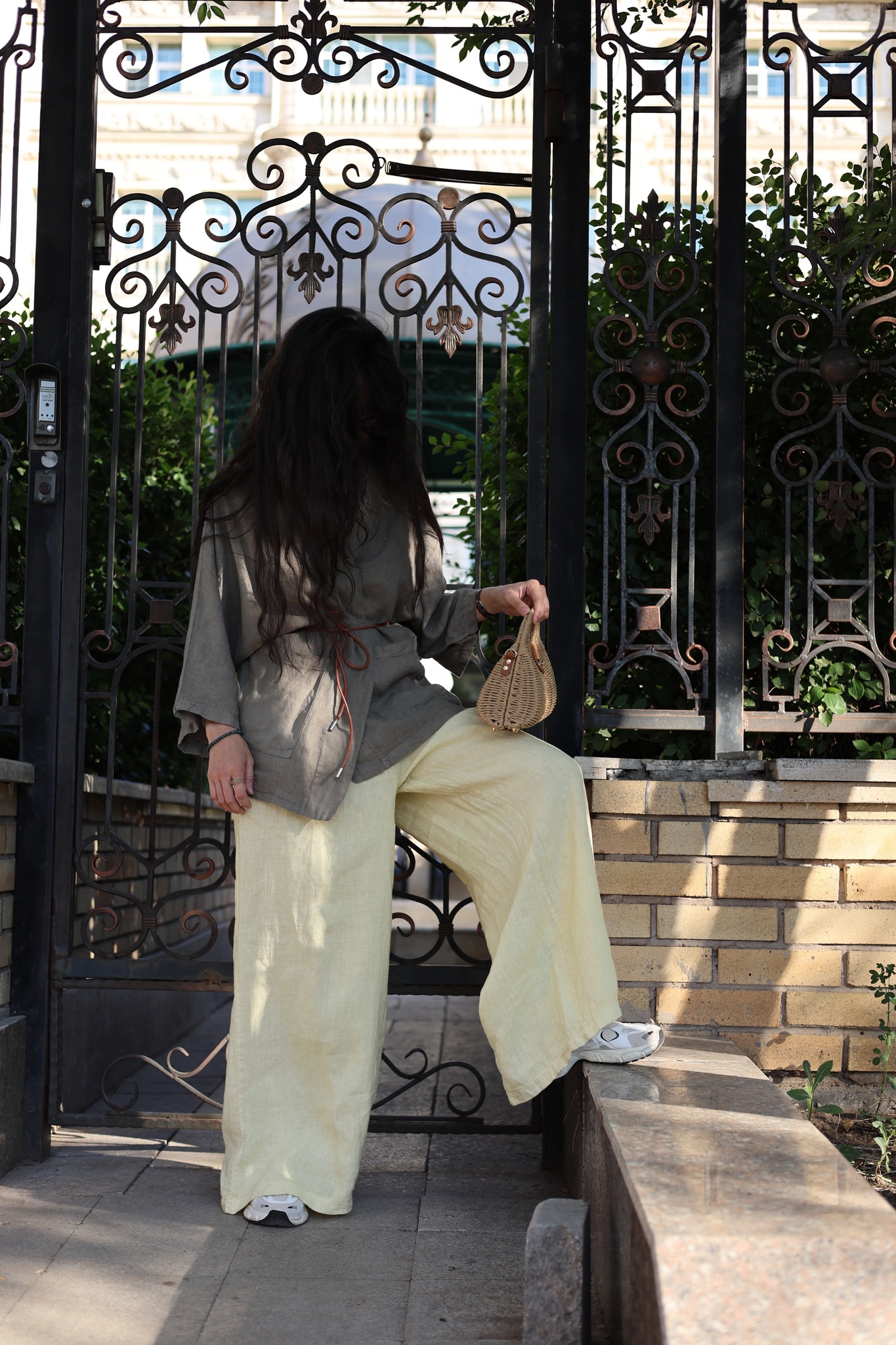 брюки из 100% льна с высокой посадкой, мягкими защипами и плавным силуэтом. лёгкие, дышащие и комфортные даже в жару.