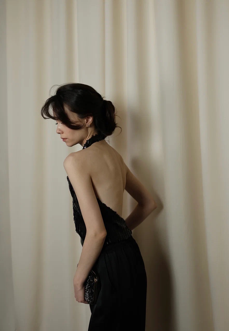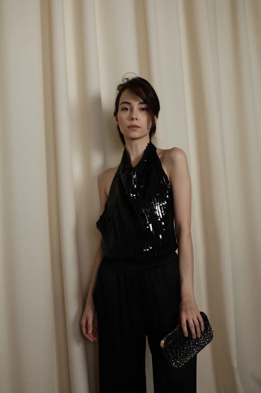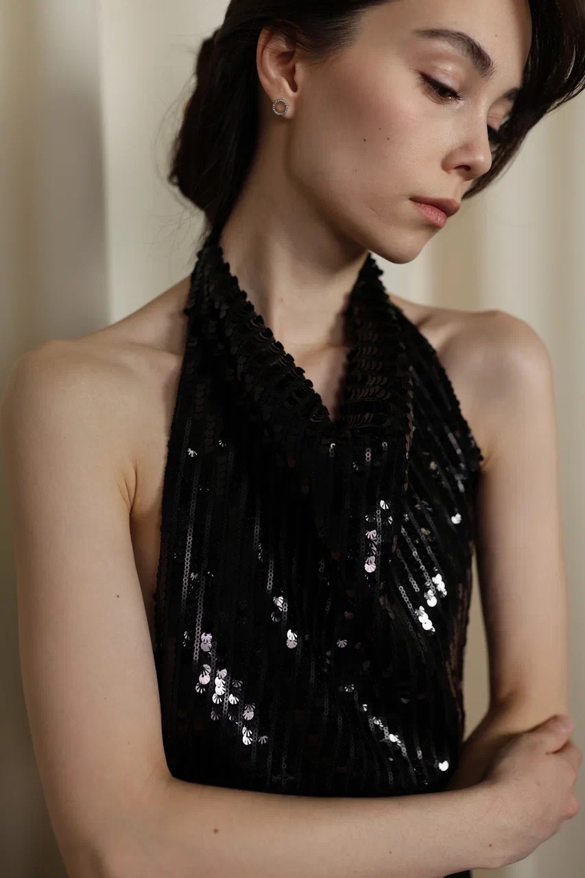 топ с пайетками и драпировкой у горловины. открытая спина добавляет образу чувственности, а плотная посадка по талии — комфорта.