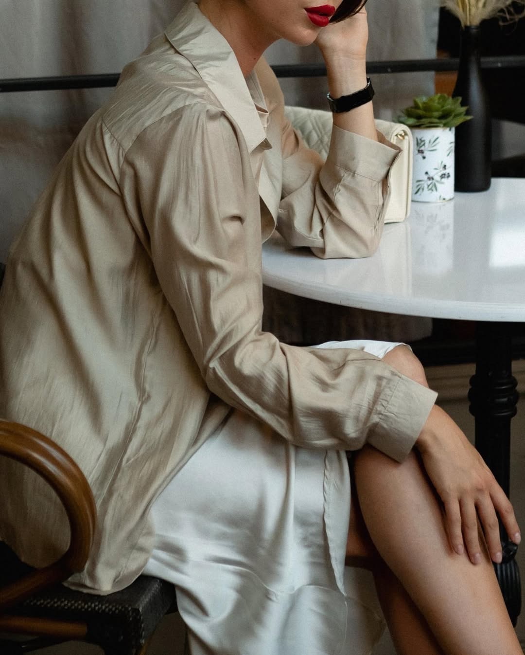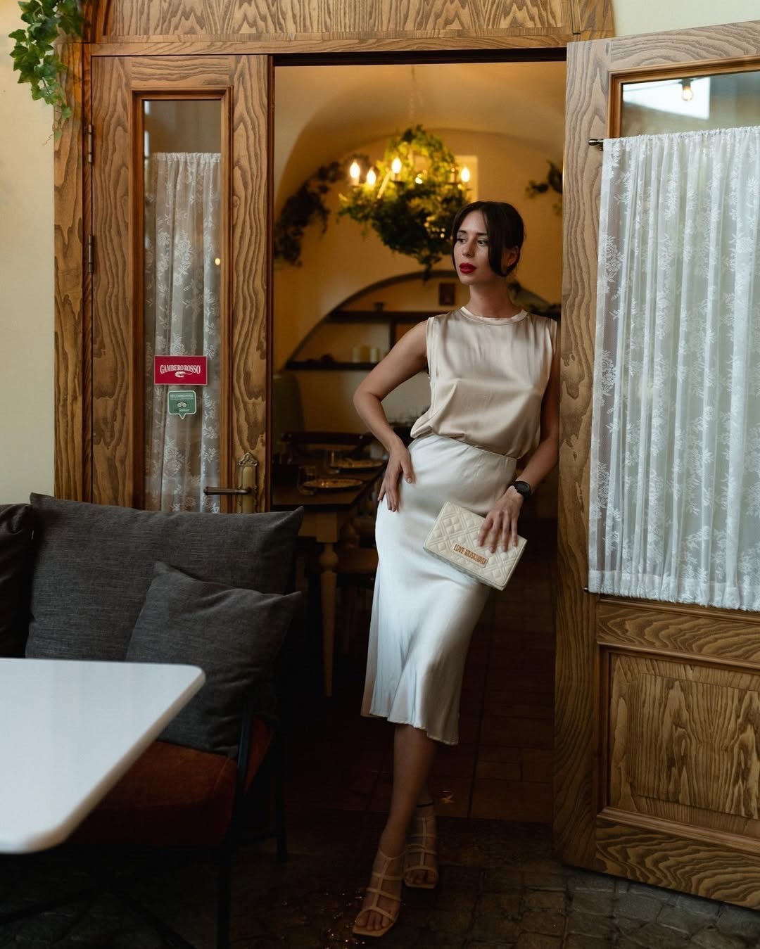 длина миди открывает щиколотку и визуально вытягивает силуэт.