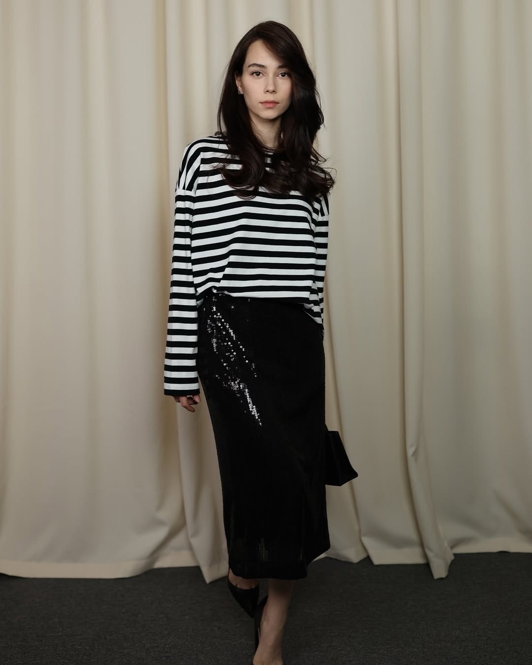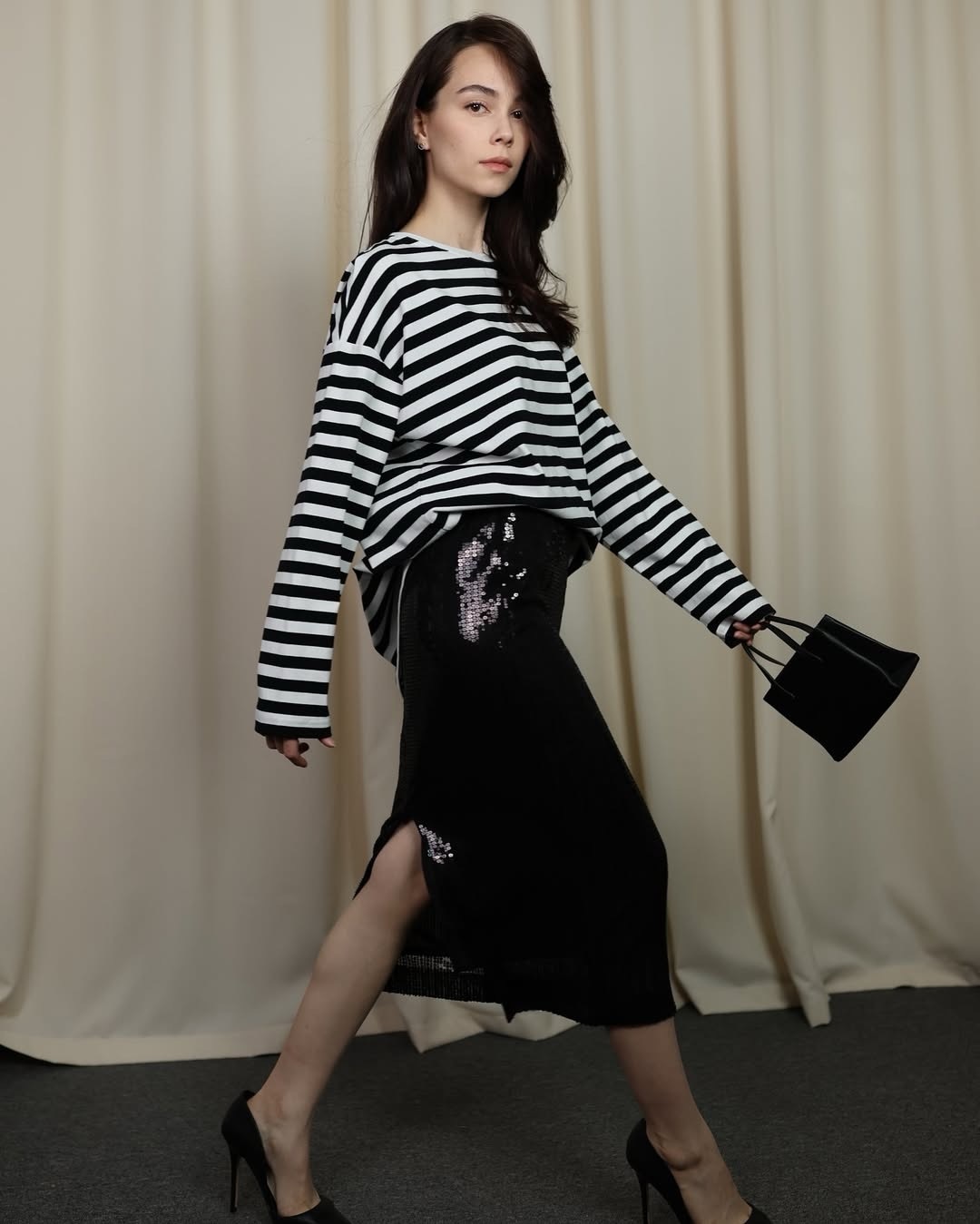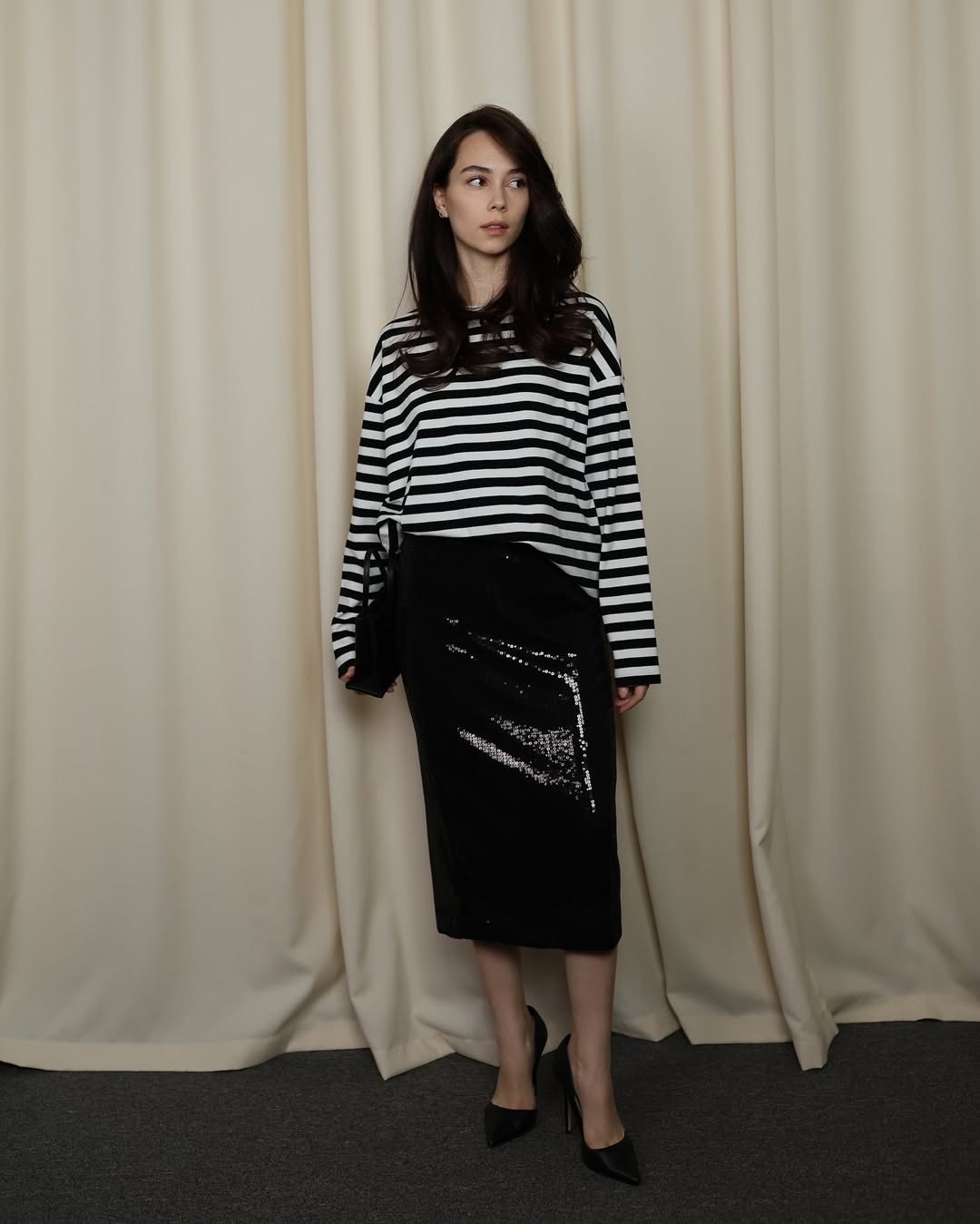 черная трикотажная юбка длины миди с боковым разрезом. украшена пайетками, которые переливаются при движении, создавая эффект динамики. эластичный пояс обеспечивает комфорт и посадку по фигуре.