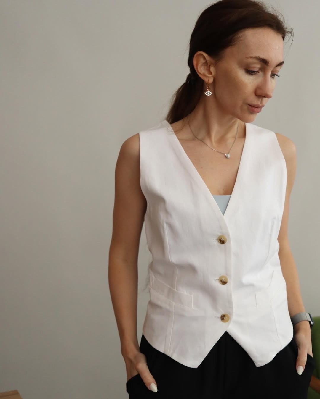 идеальный баланс строгости и женственности. приталенный силуэт подчёркивает фигуру, глубокий v-образный вырез визуально вытягивает линию шеи. акцент — на лаконичные пуговицы и ровный крой.
